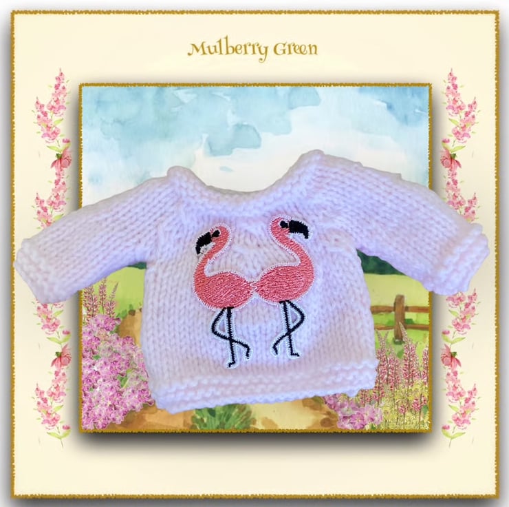 A pretty pink jumper, decorated with two cute flamingos, to fit the Mulberry Green characters. The jumper is hand knitted.