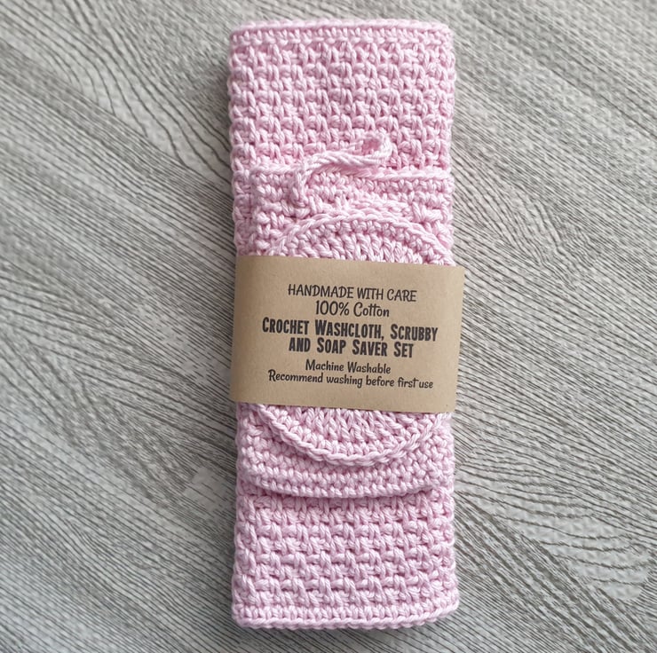 100% Cotton Handmade Pink Crocheted Wash Cloth, Scrubbie & Soap Saver Set, Reusable, Face Cloth, Dish Cloth