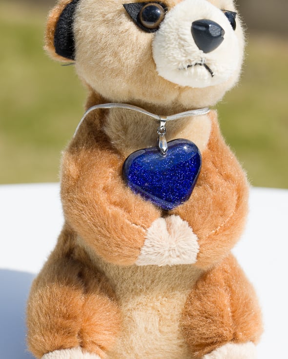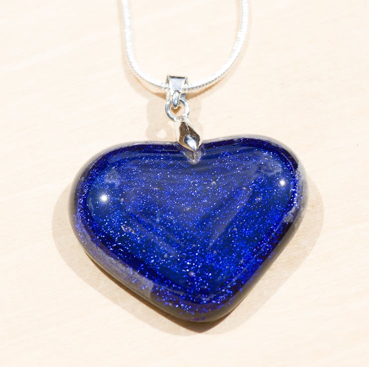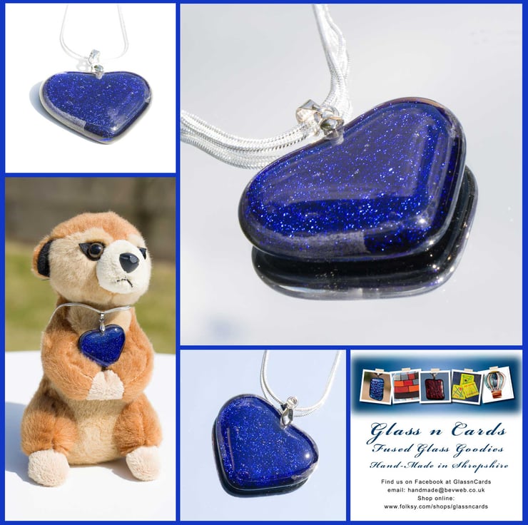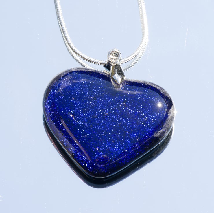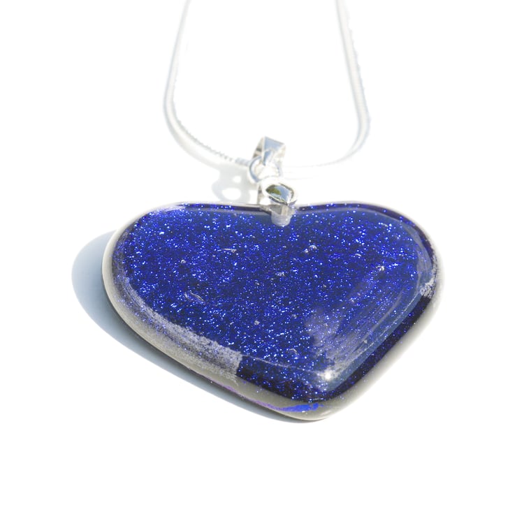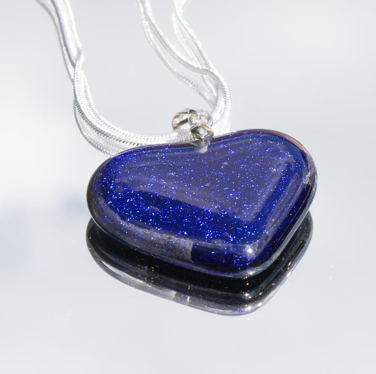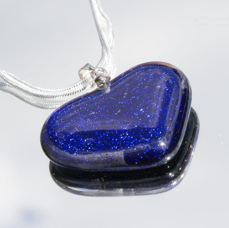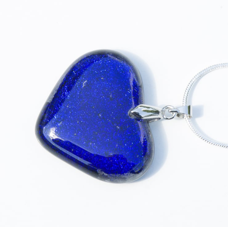 This pretty heart-shaped pendant is approximately 3 cm long and 2.5 cm at its widest. It has been hand-cut from a sheet of dichroic glass and is a sparkly blue colour.