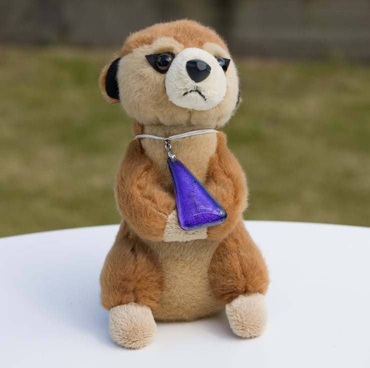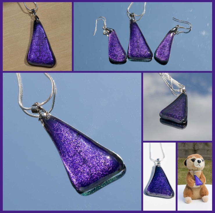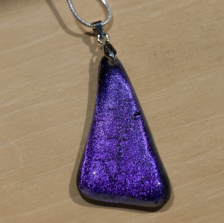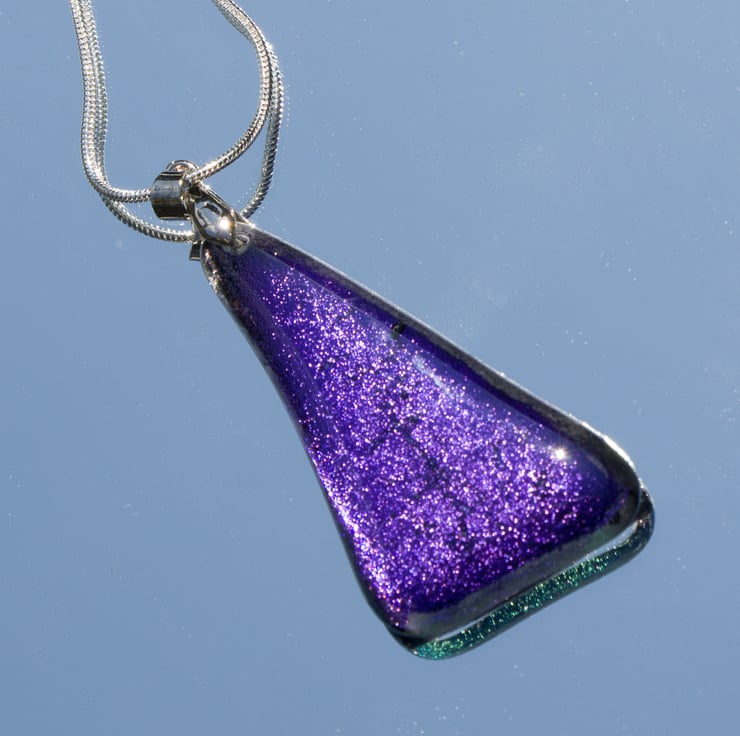 This triangular pendant is a stunning, deep purple colour. It is approximately 4.5 cm long and 2.5 cm at its widest. It is strung from the tip of the triangle on a sterling silver chain. It will be shipped in a small presentation box.