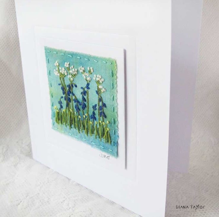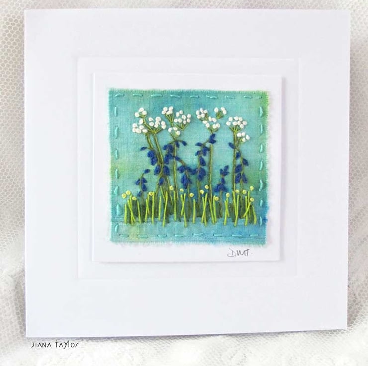 HAND EMBROIDERED GREETING CARD BLUEBELLS COW PARSLEY