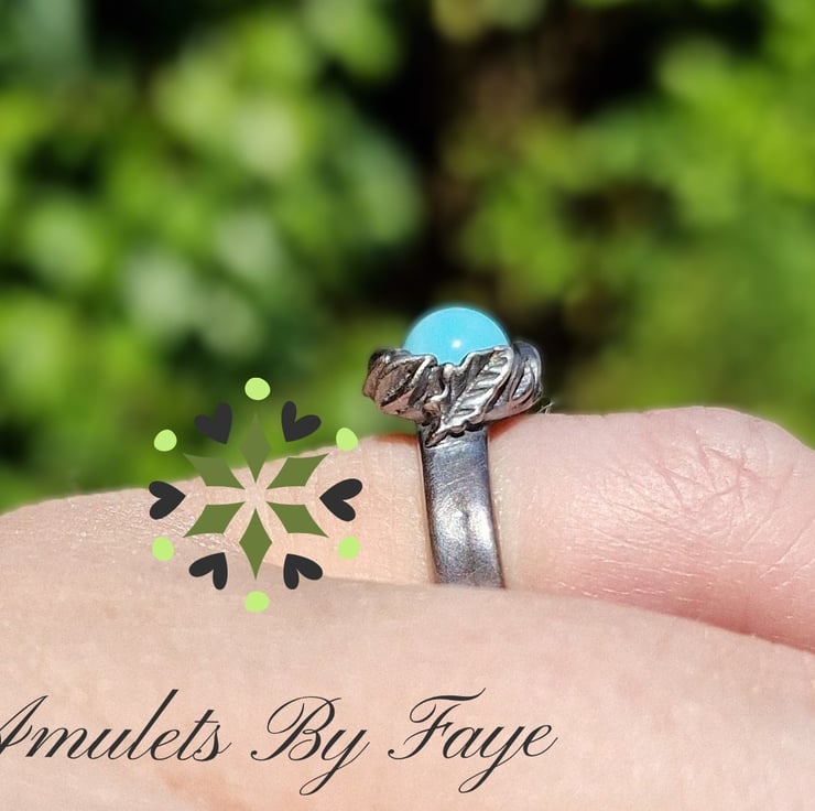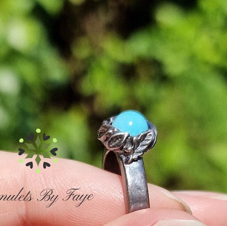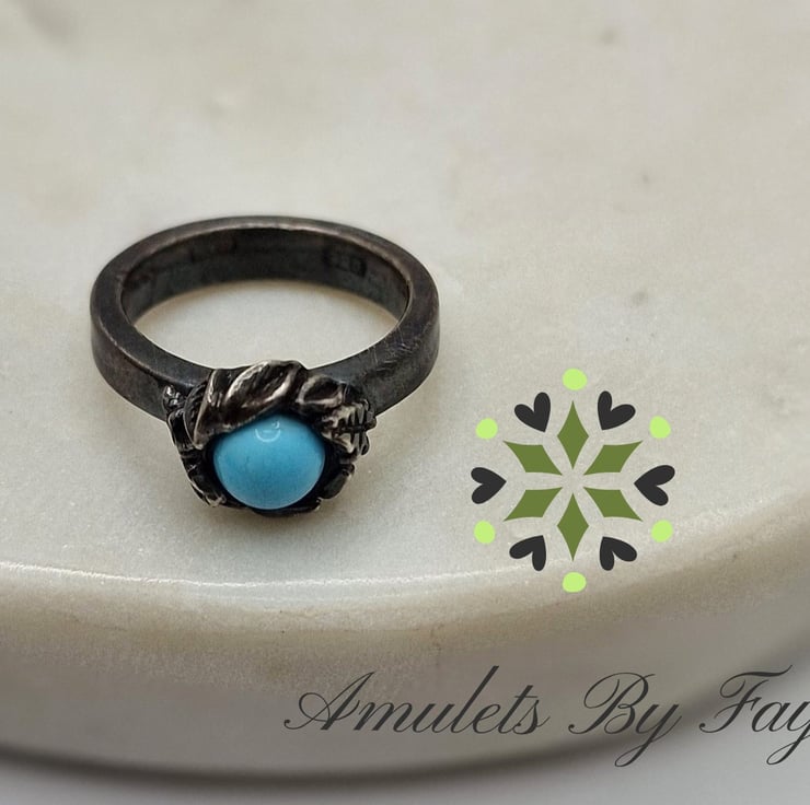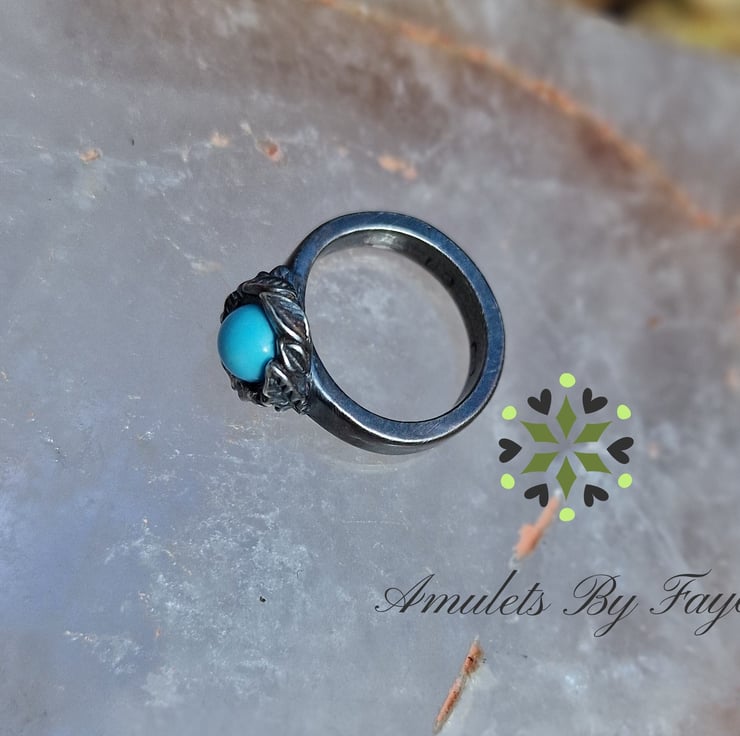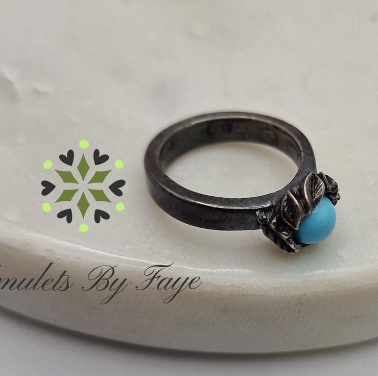 Recycled Sterling Silver, Ring, Leaves surrounding A Turquoise Gemstone. Size I