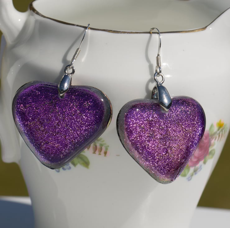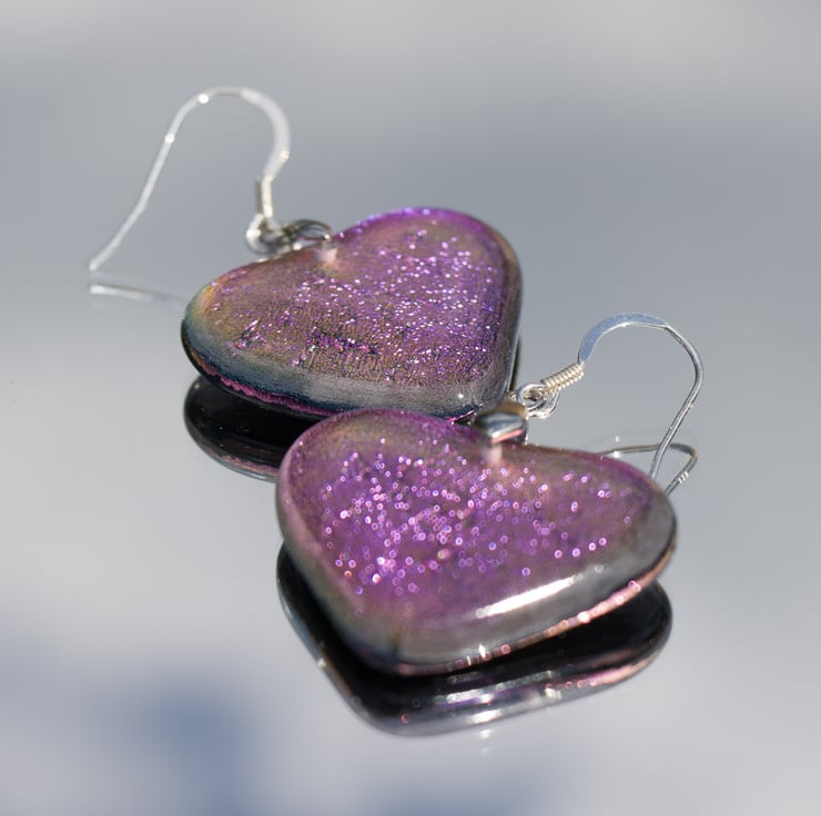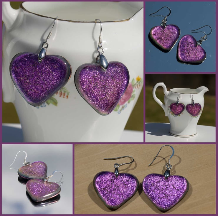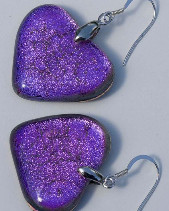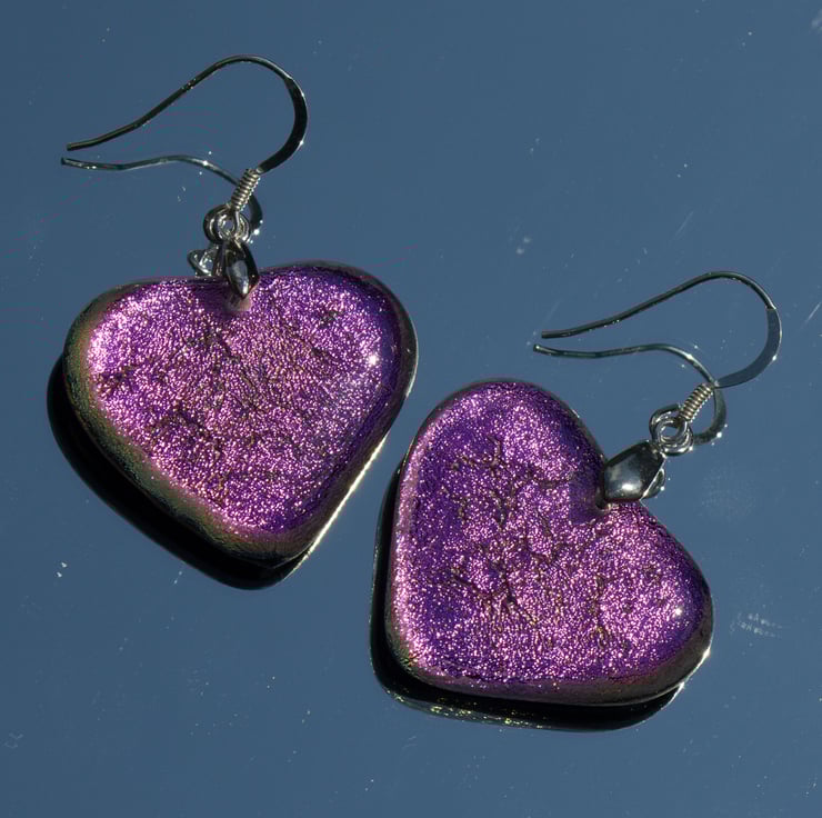 These heart-shaped earrings are made from pale purple dichroic glass and are mounted on sterling silver wires that allow them to move when worn. They will make an ideal addition to any contemporary jewellery collection.