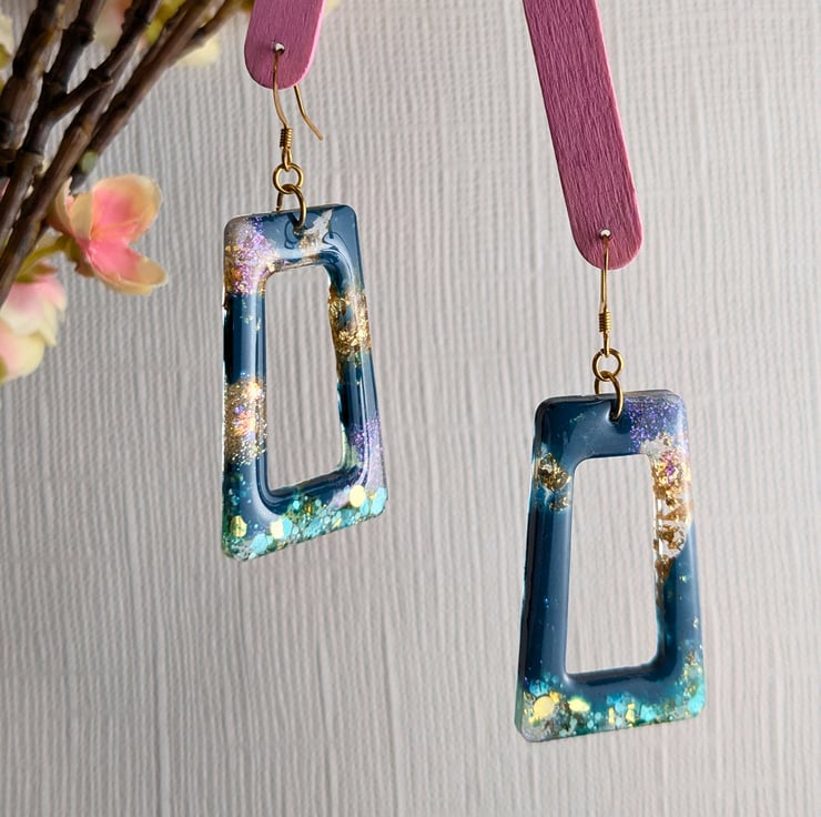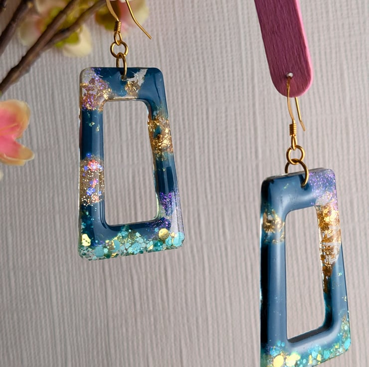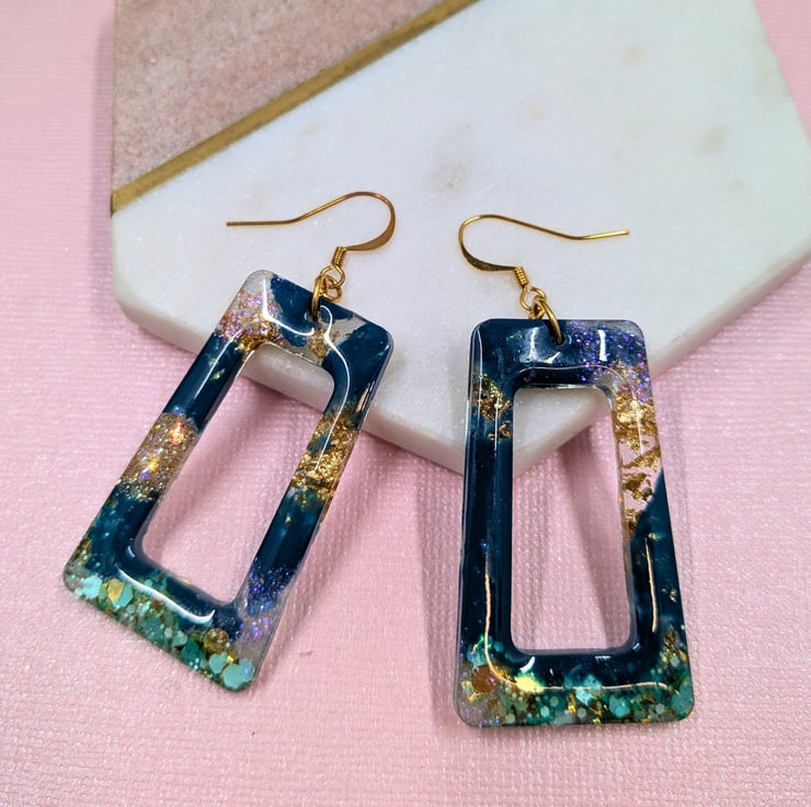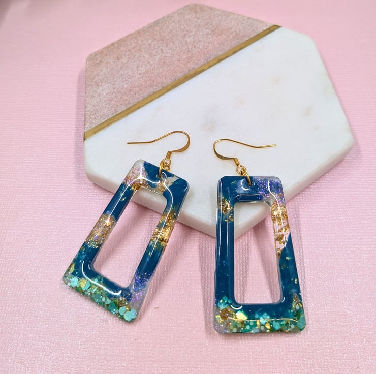 Imagine a gorgeous blend of deep teal blues, a touch of shimmering glitter, and delicate flakes of real gold leaf, all perfectly captured within smooth, glossy resin. The contemporary trapezium shape features a stylish cut-out, giving these earrings a modern and eye-catching look.