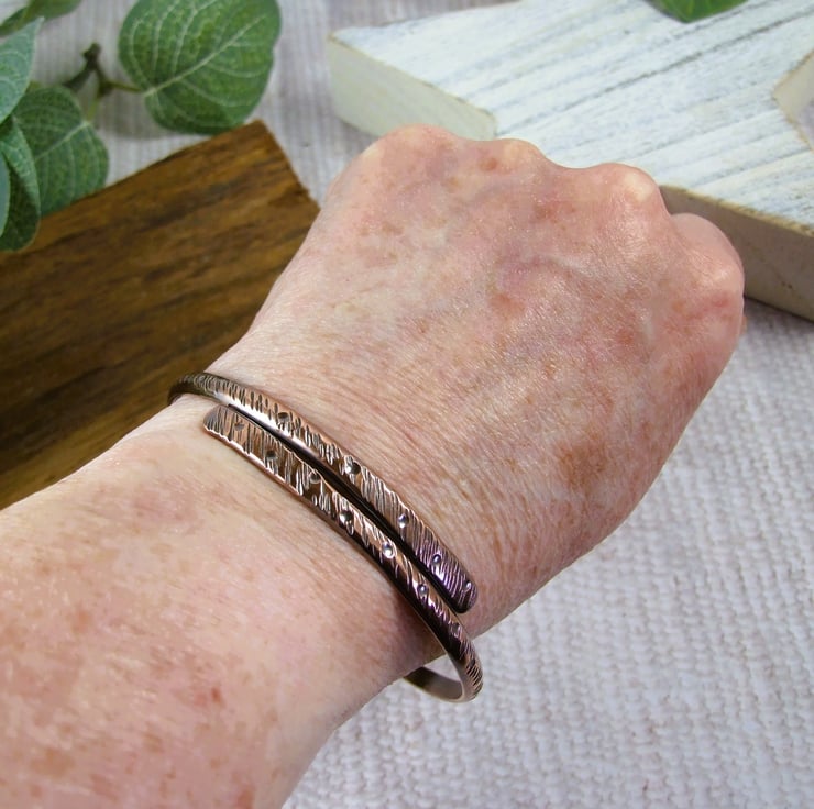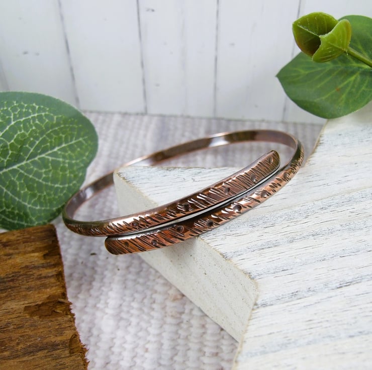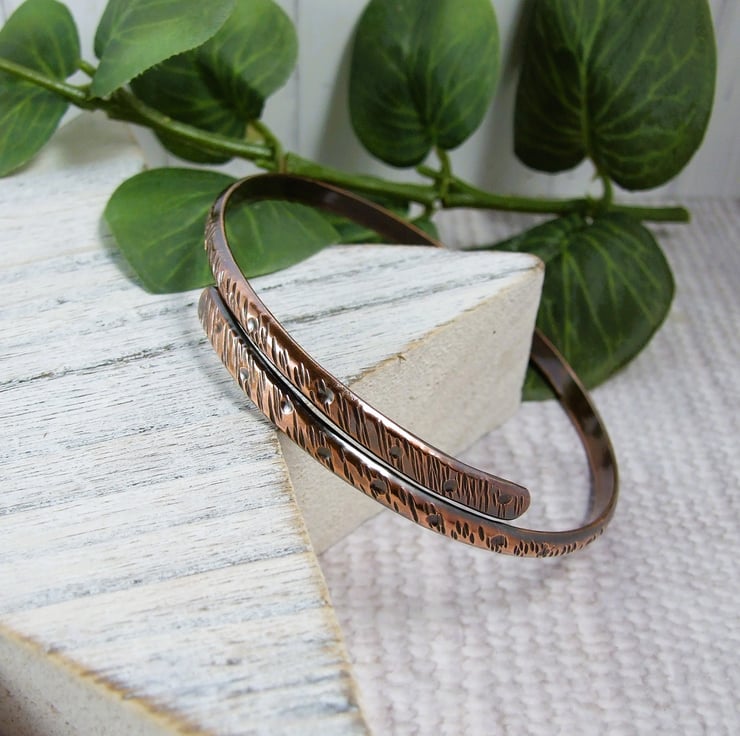 I have made the bangle from 4mm solid copper wire which I have flattened the ends and shaped. Then created a rustic patterns to various hammers and punches. Bangles does not open and close, though it could be adjusted slightly to fit. The bangle is designed to fit over your hand, please refer to the size guide photograph.