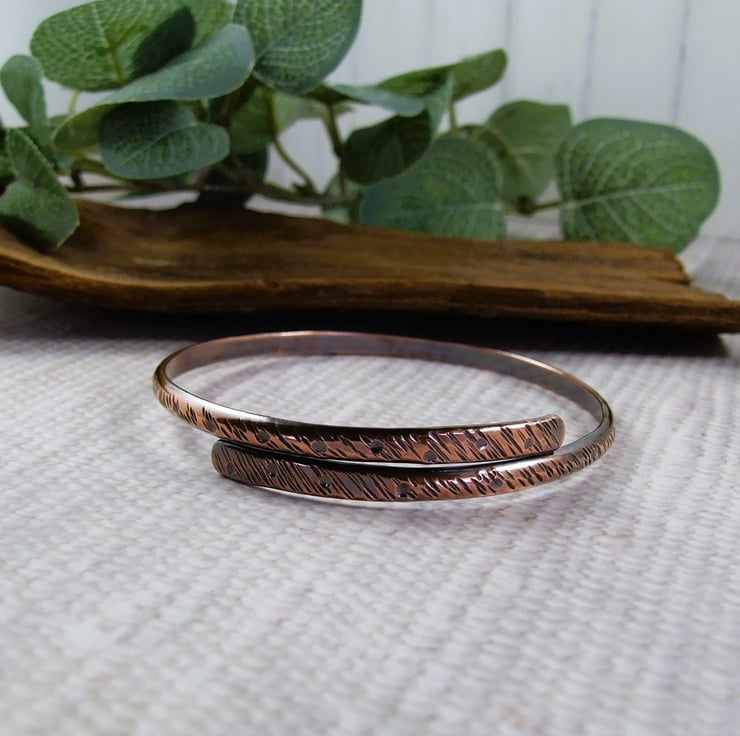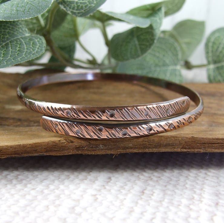 Hand forged copper pattern overlap bangle. Size XL 22cms circumference, 7cm diameter. See bangle size guide photo.