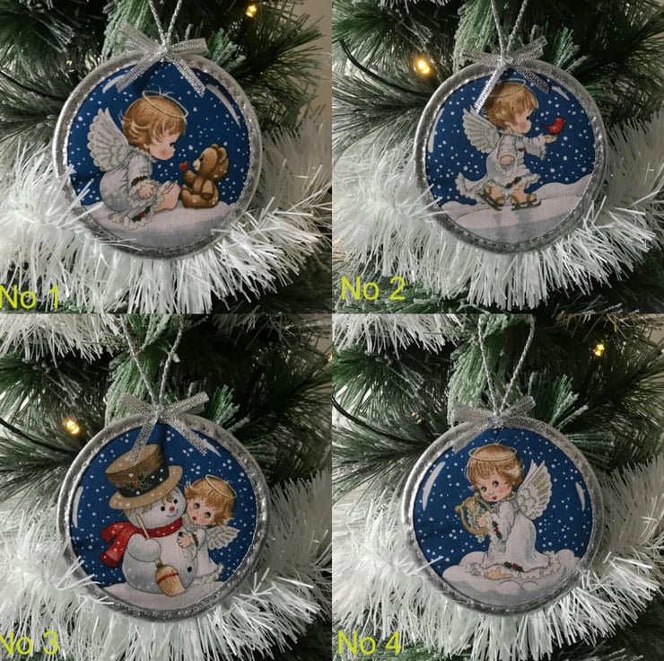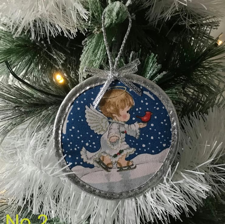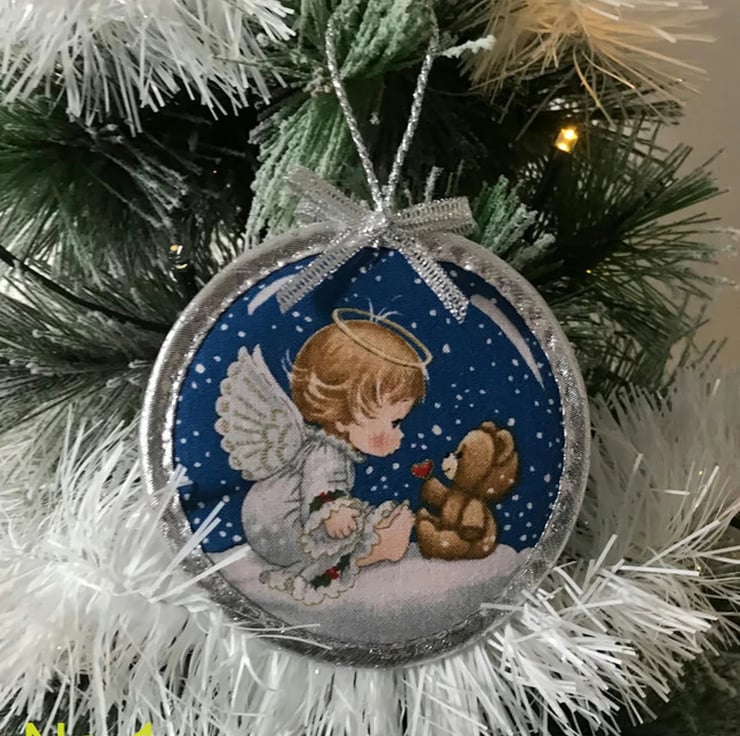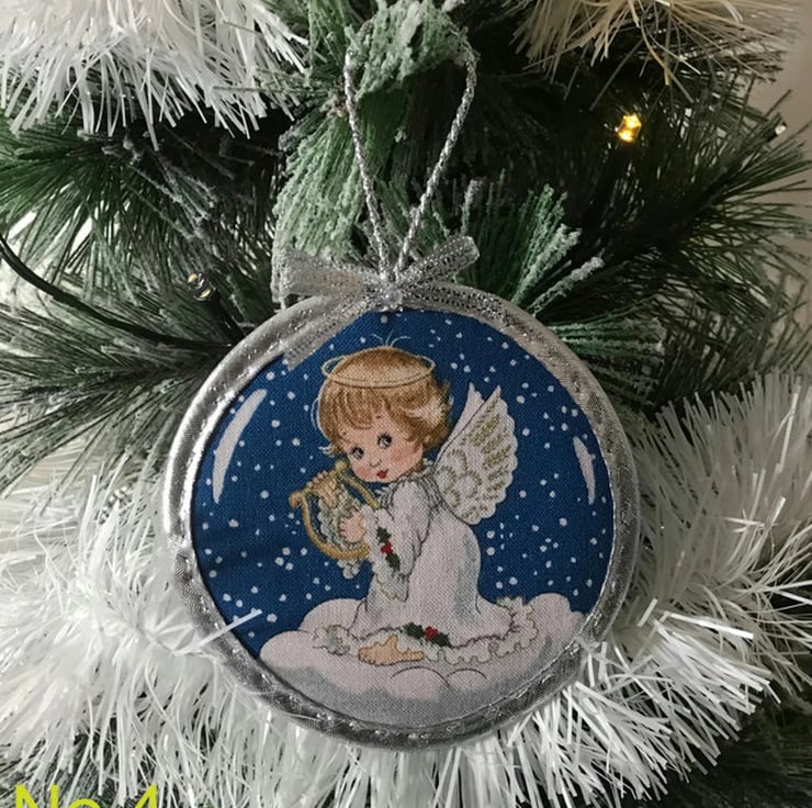 Brighten up your festive décor with this charming set of four angel baubles, perfect for hanging on your Christmas tree or as wall adornments. Each bauble is double-sided, gently padded, and edged with silver trim to give a lovely, handcrafted finish.