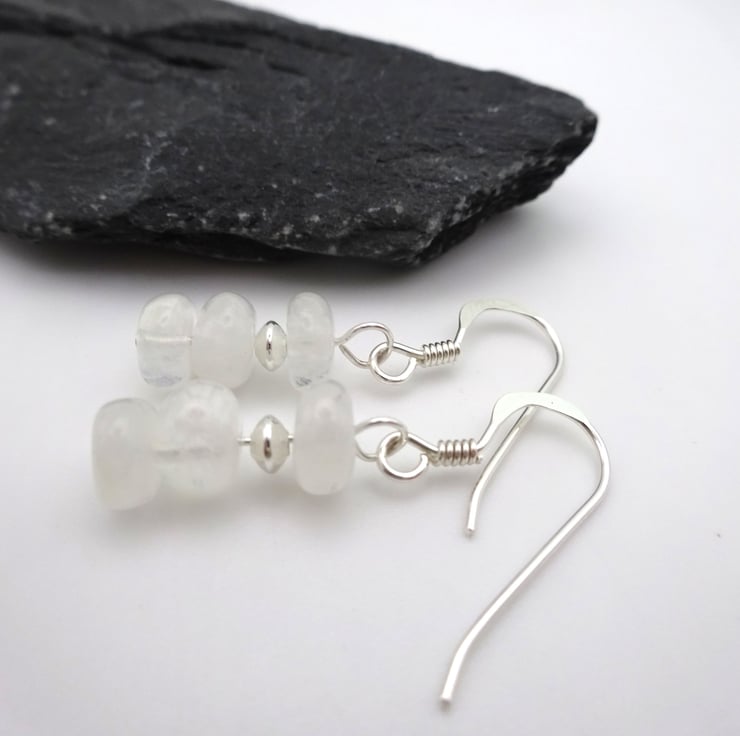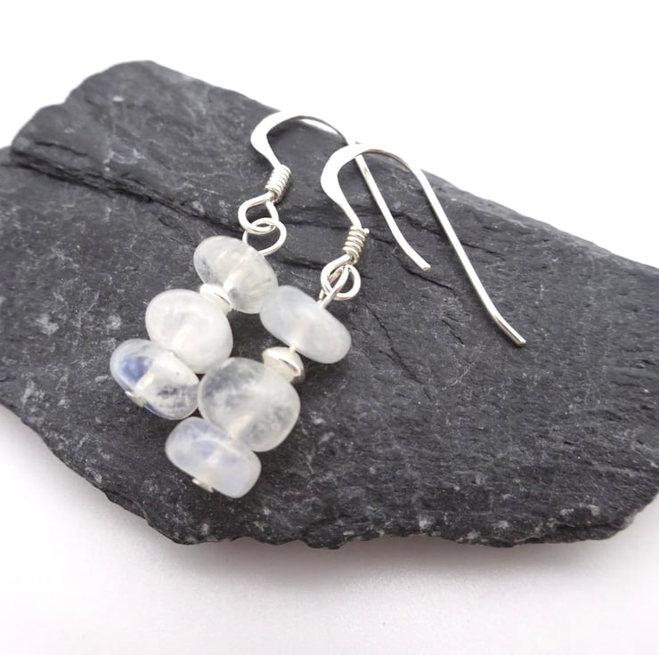 A pair of sterling silver earrings made with Rainbow Moonstone gemstone beads and sterling silver beads.