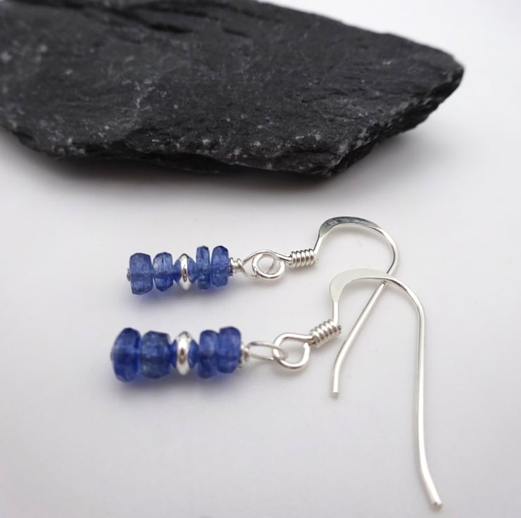 A pair of sterling silver earrings white feature small Kyanite gemstone beads and sterling silver disc beads.