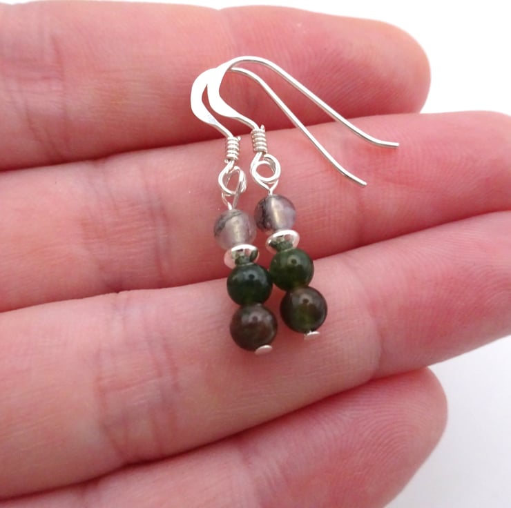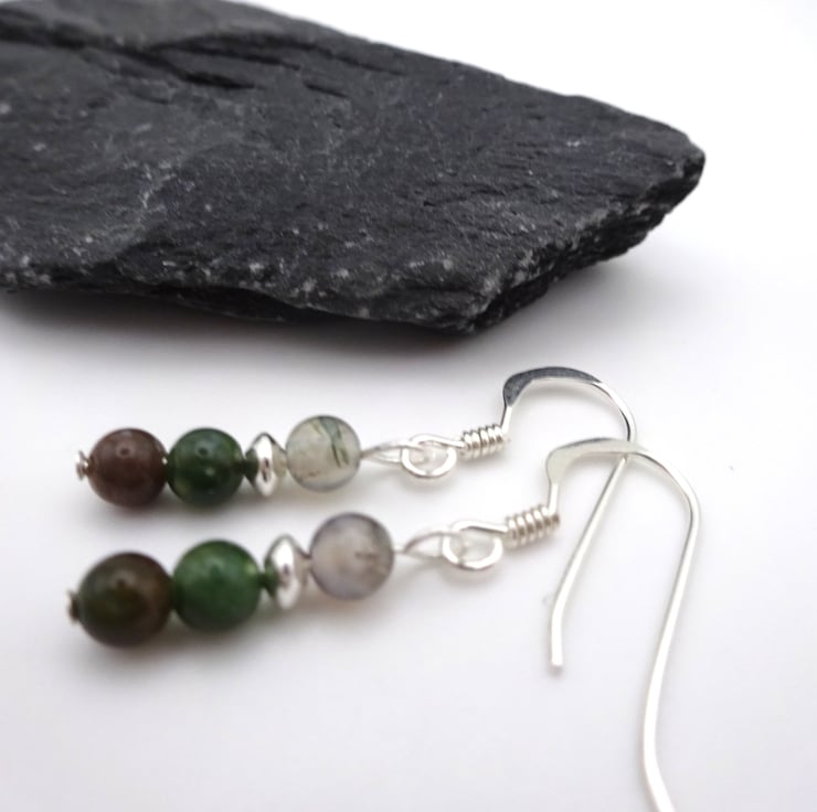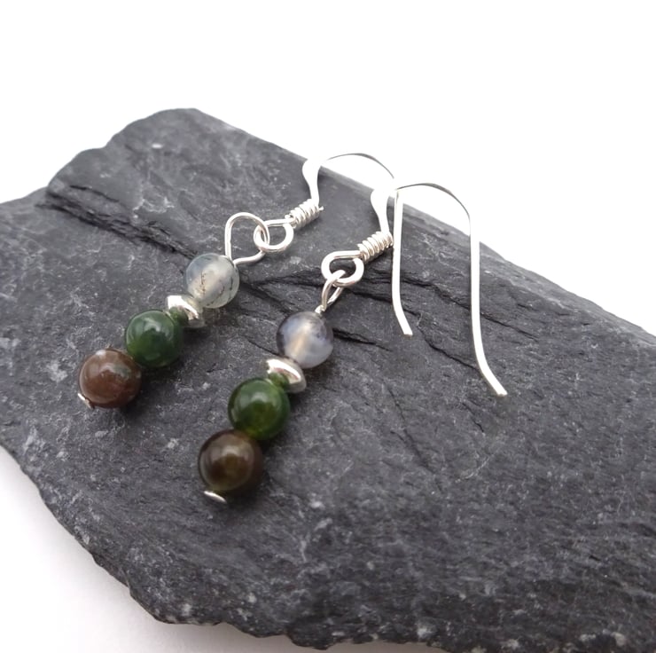 A pair of sterling silver earrings made with Indian Agate gemstone beads and silver disc beads.