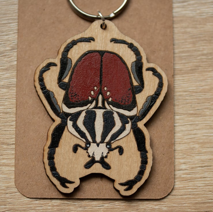 This hand-painted Goliath beetle keyring is full of charm and character. Made from laser-cut wood and painted with care, each beetle is a little different.