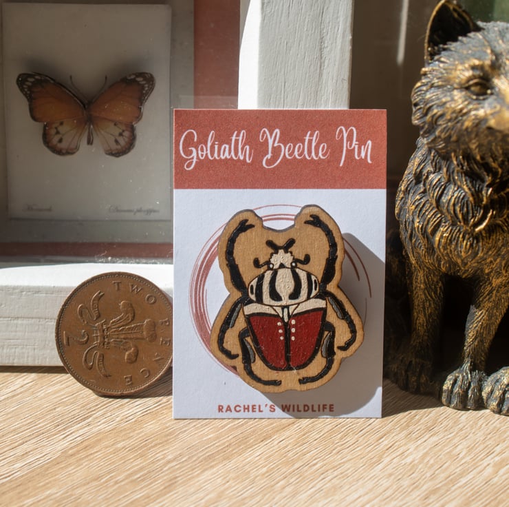Bring a little wild wonder to your jacket, bag, or lapel with this Goliath beetle wooden pin badge – a tiny tribute to one of nature’s most magnificent mini beasts.