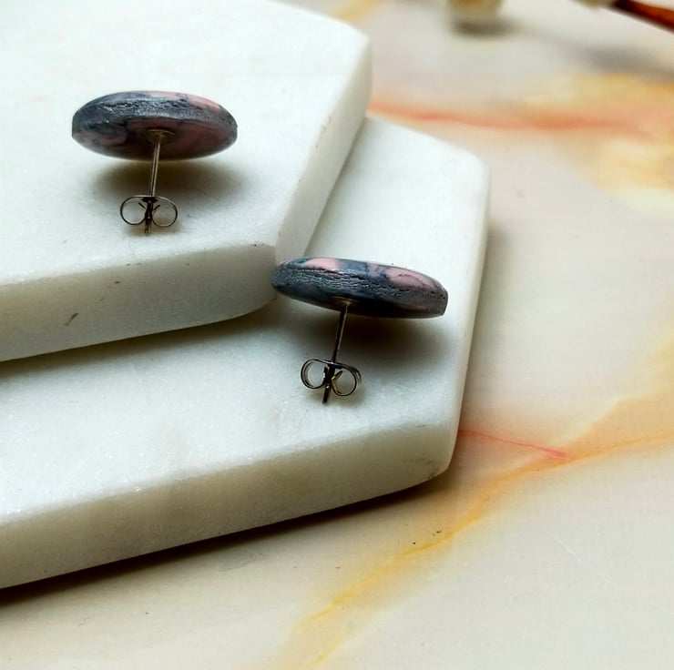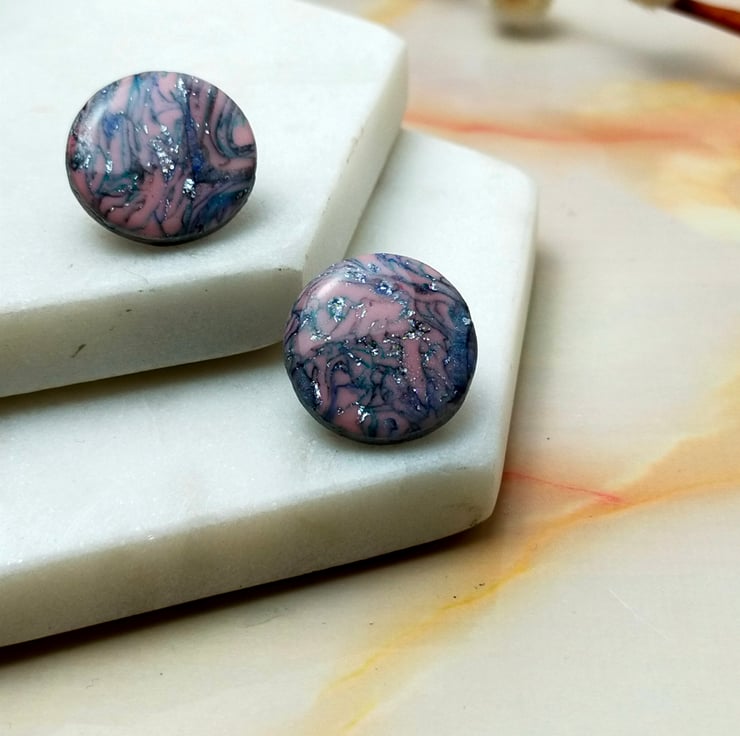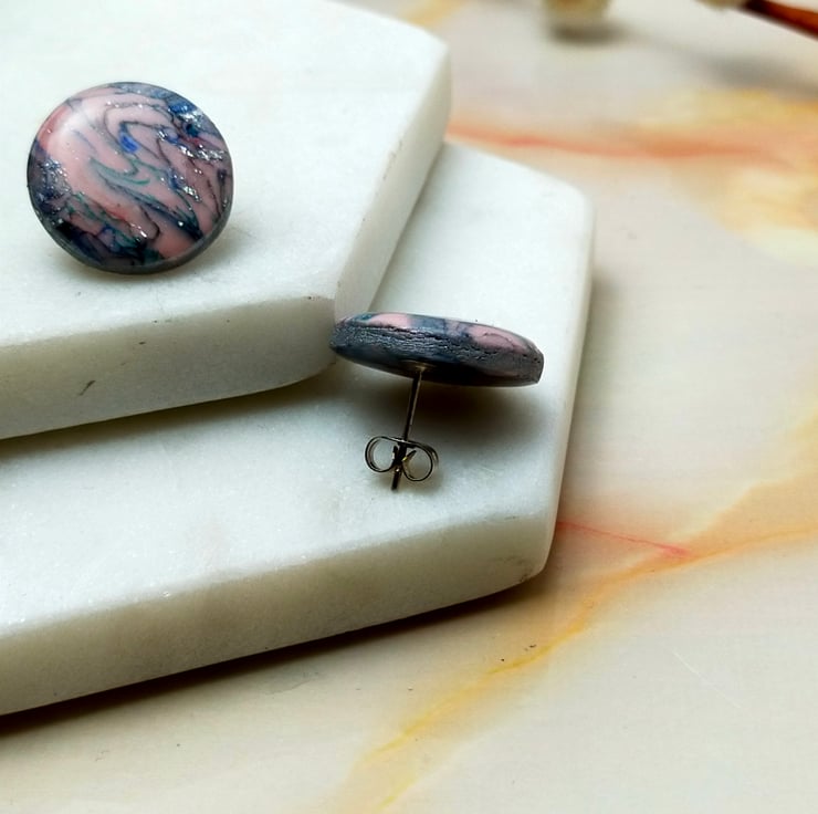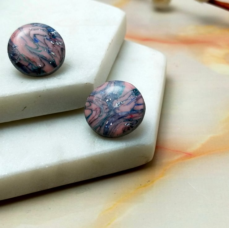 The delightful marble design features a soft blend of various pink shades, creating a gentle and eye catching effect. Crafted from lightweight polymer clay and finished with a lovely high shine resin, these studs are perfect for everyday wear.