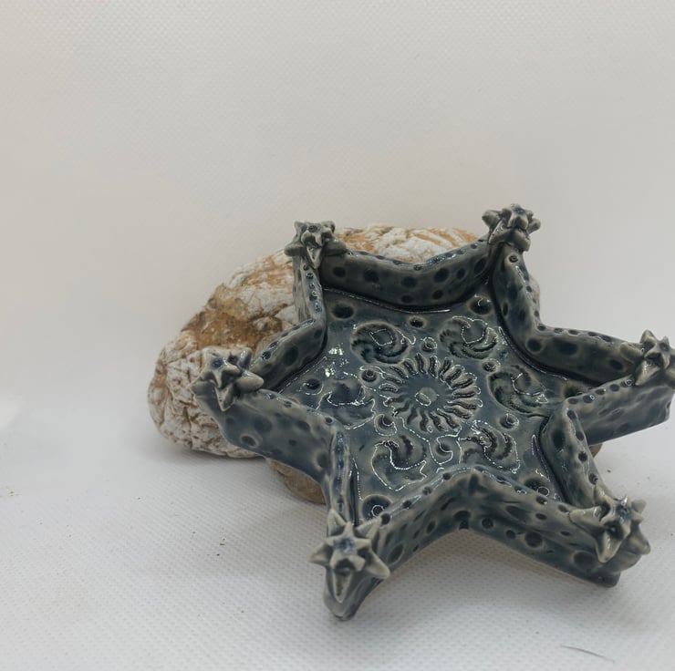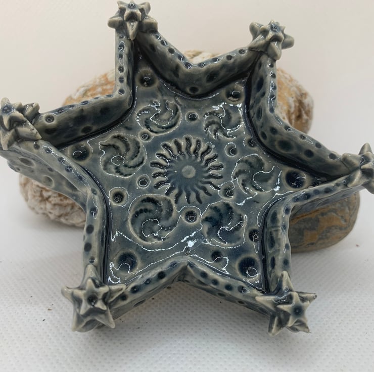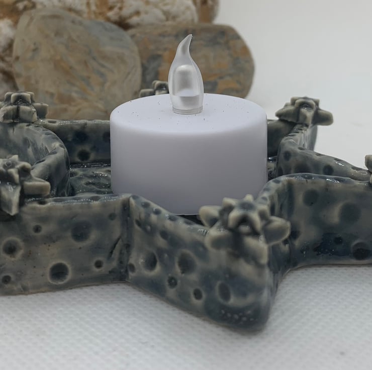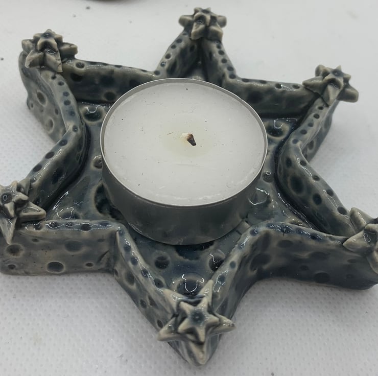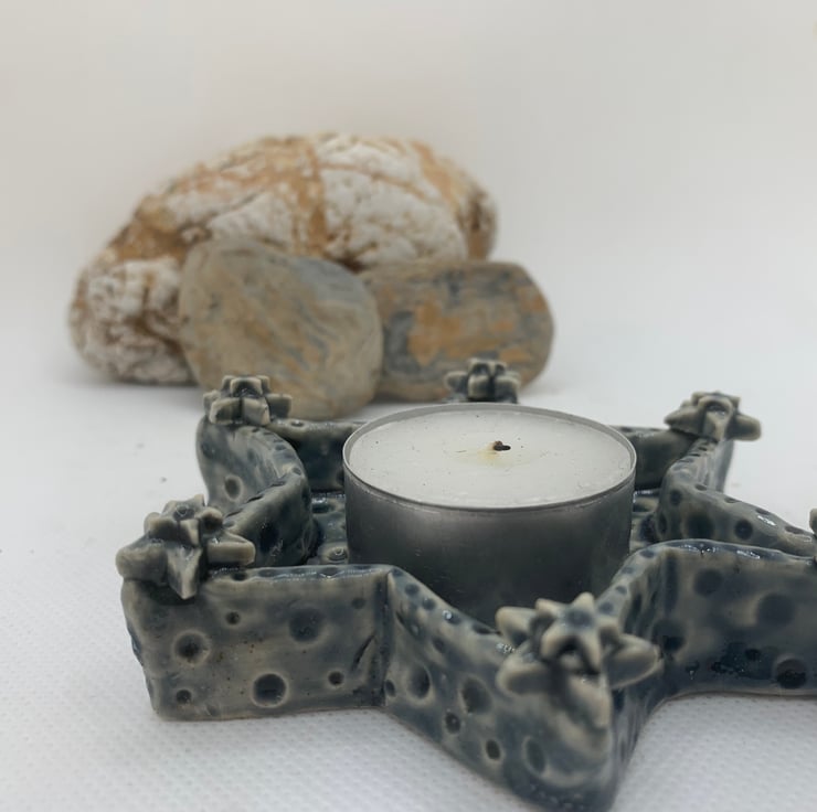 Star shaped tea light holder with stamped decoration and added stars. The glaze used