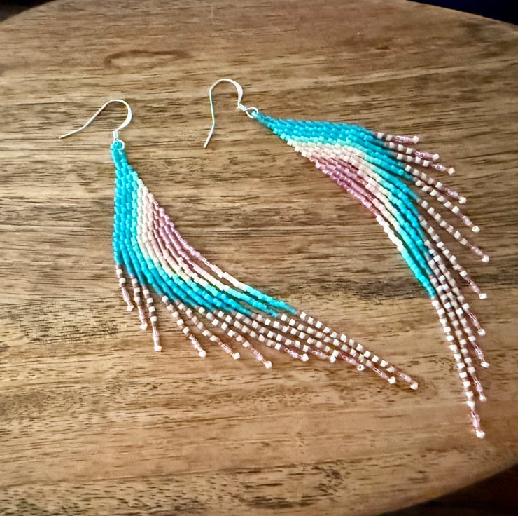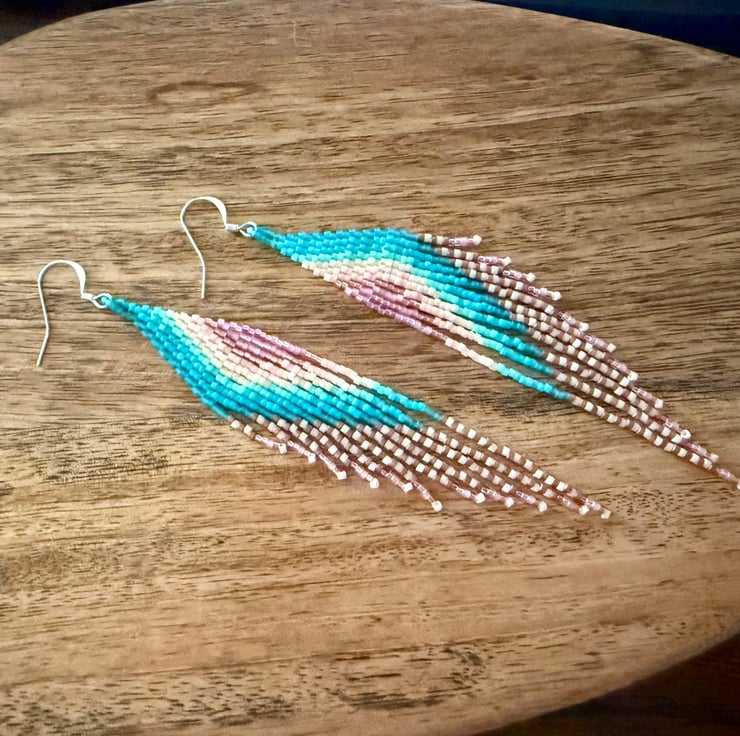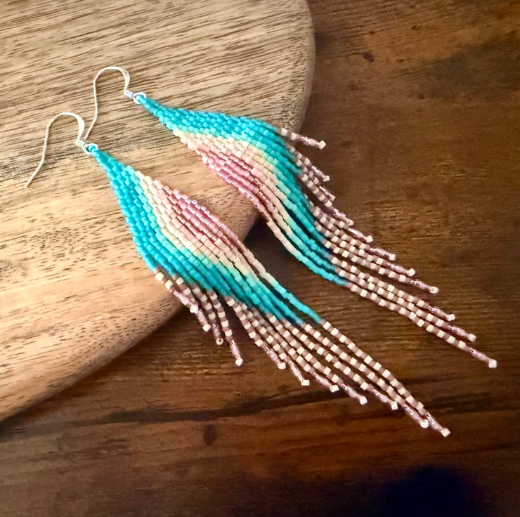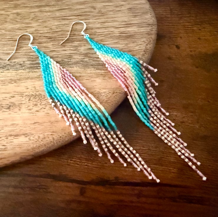 The same beadwork design cascades into long delicate fringe that is finished in a matt copper and cream feathered pattern. The fringe has an ascending long length so these earrings have plenty of swish and sway.