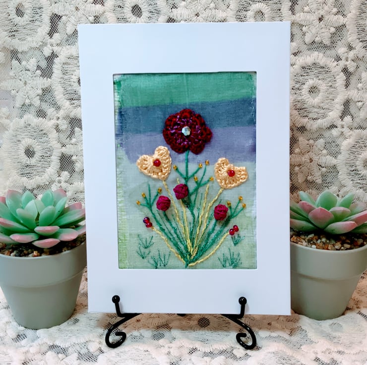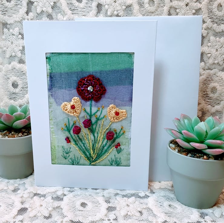 A textile card with handmade crochet flowers and rose buds. Embroidered on layers of fine organza in green blues and lilac on an organic cotton base.
