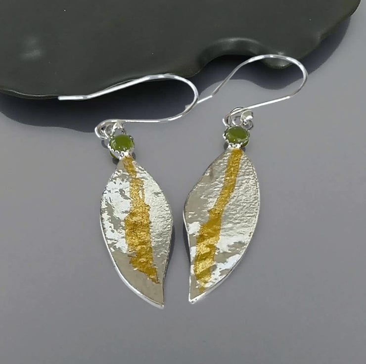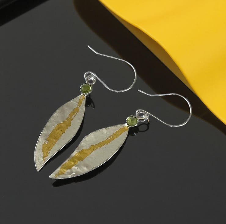 Solid 925 Sterling Silver earrings with gold. Crafted with eco friendly recycled silver. the silver is bought to high heat using the ancient Keum-Boo technique, where 24ct gold foil is melted onto the Sterling silver surface. The earrings are in the shape of a leaf. Each piece will have its own unique style. The earring features a Peridot Gemstones. The length is approximately 4.5cm.