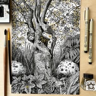The artwork began in rough pencil layout, I then worked over the top in black ink fineliner pens, black watercolour wash was added for shadows and depth and then gold ink for the highlights.