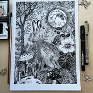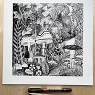Black and White nature inspired art print of my original watercolour, ink pen and gold ink drawing.