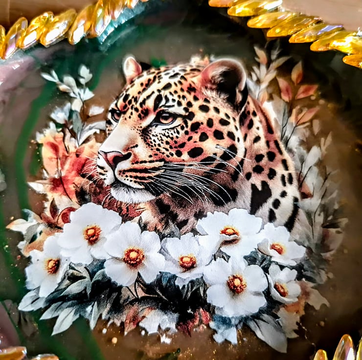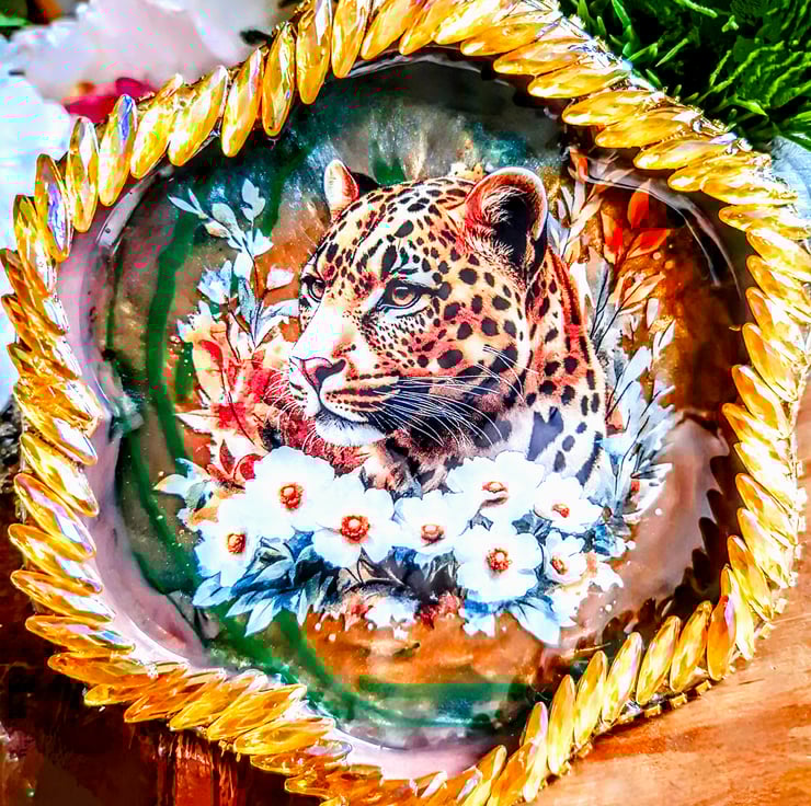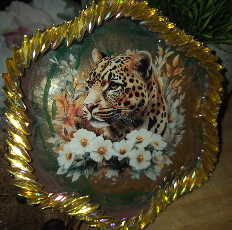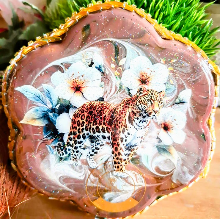A beautiful hand-crafted leopard themed coaster/trinket tray, decorated on both sides by me.