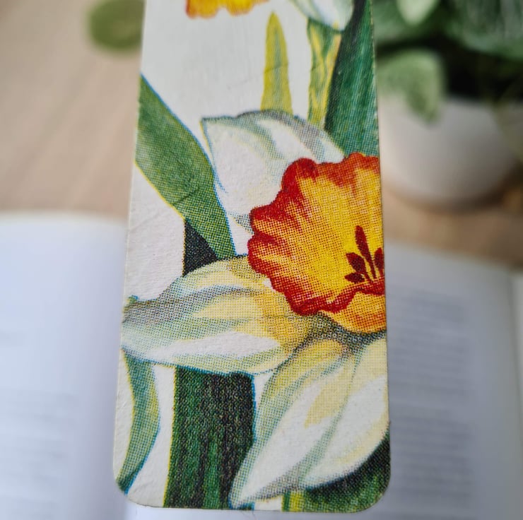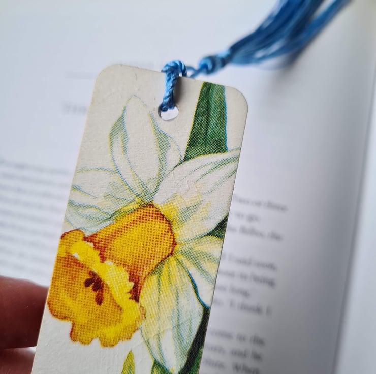 This wooden bookmark has been decoupaged using a pretty daffodil design paper napkin, then varnished to protect it and finished with a tassel.