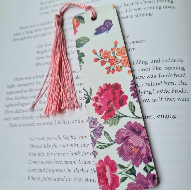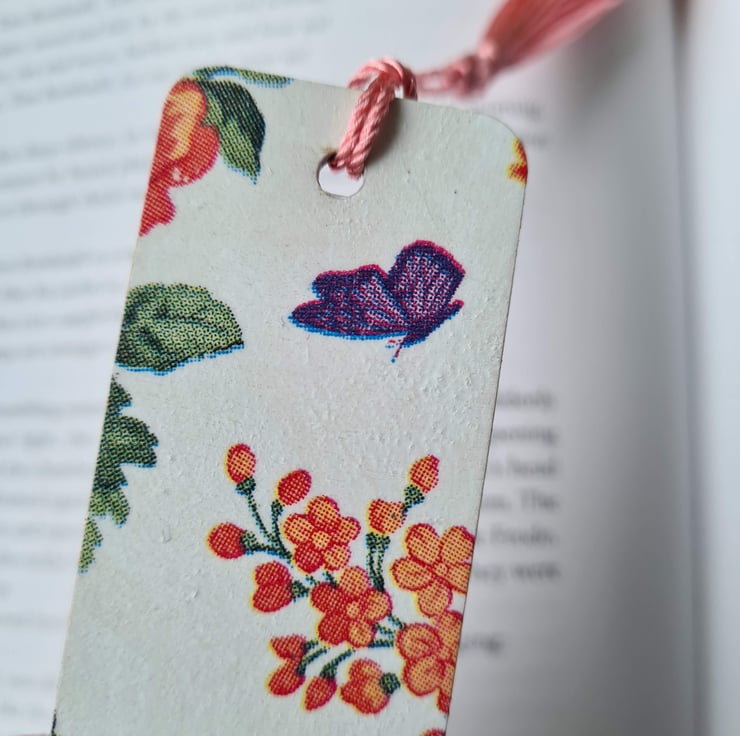 This wooden bookmark has been decoupaged using a pretty floral design paper napkin, then varnished to protect it and finished with a tassel.