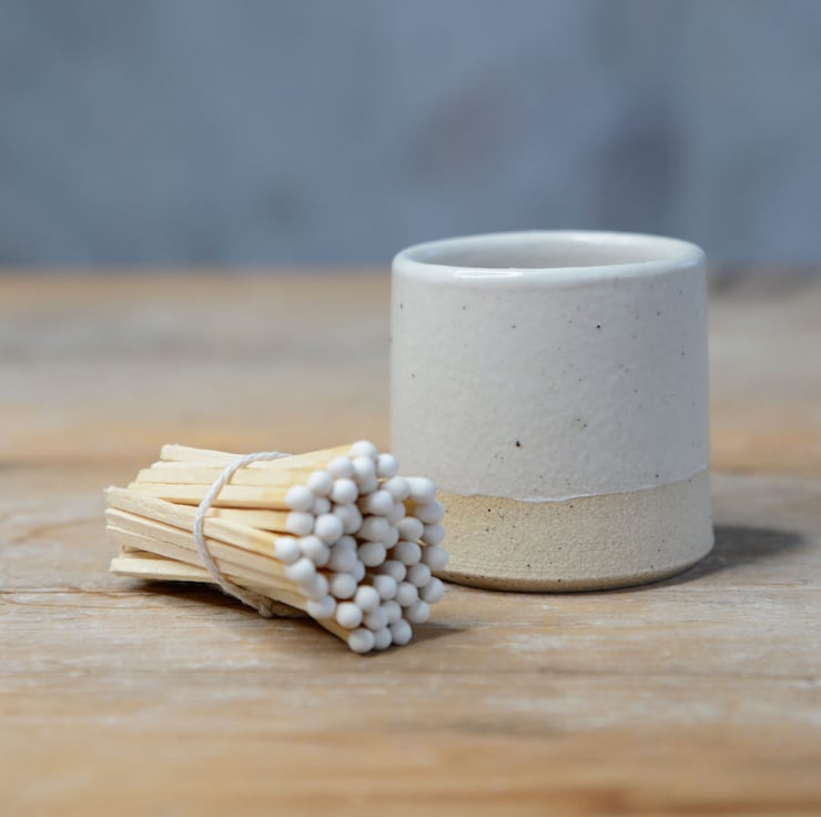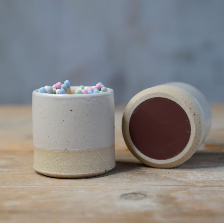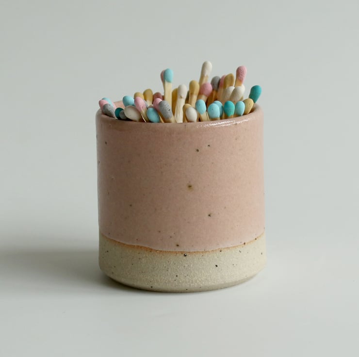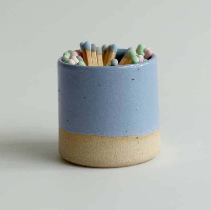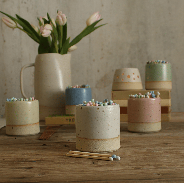 Ceramic match pot in contemporary pastel colours. The handmade striker pot holds long matches suitable for lighting candles in the home.