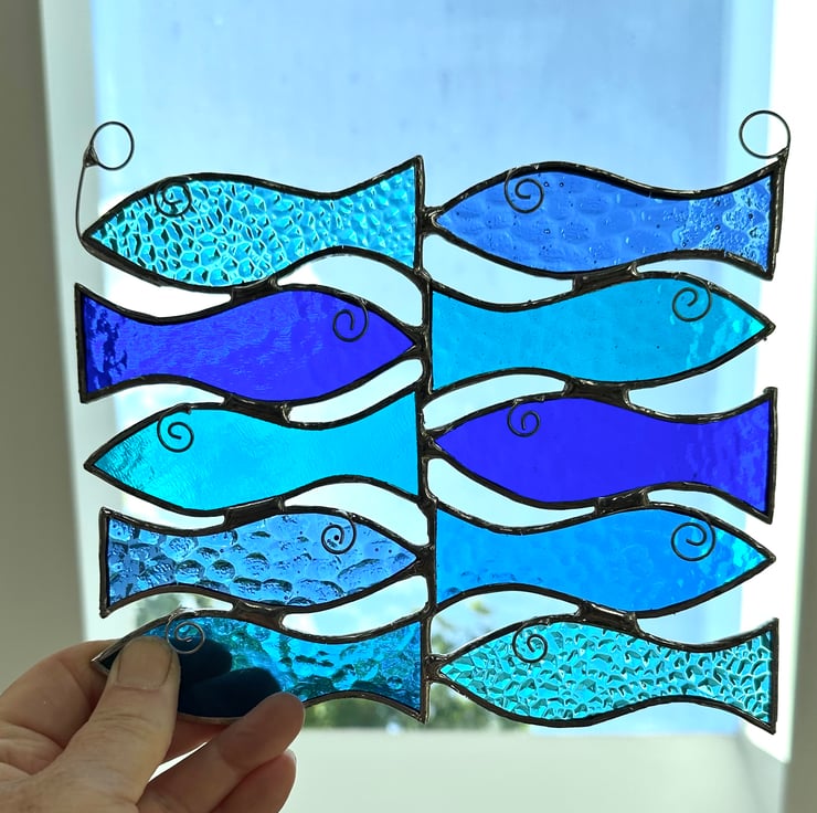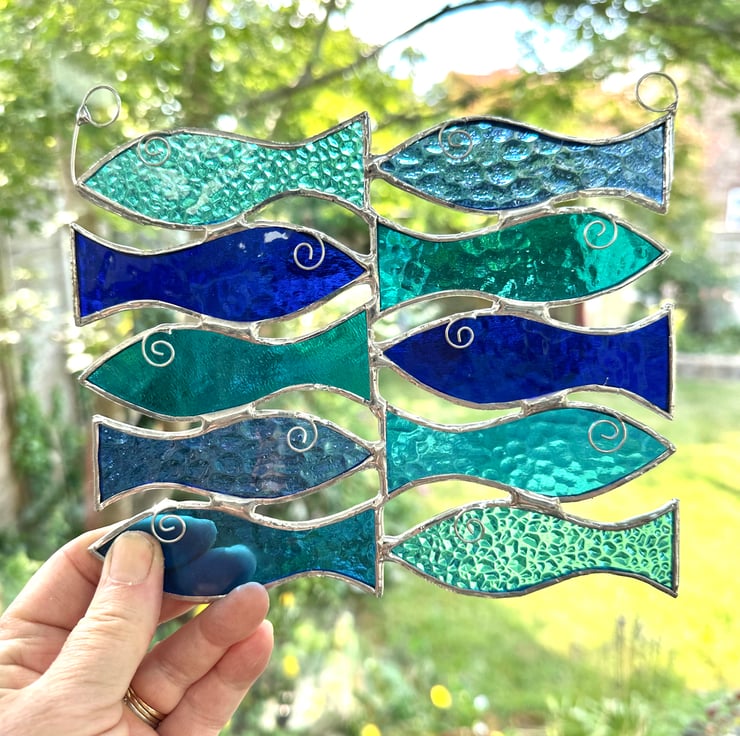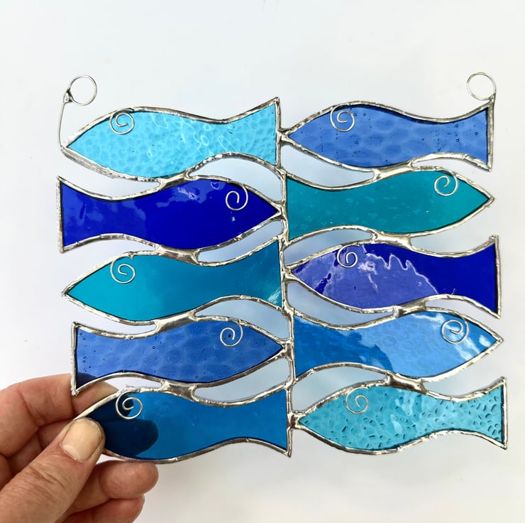 Shoal of ten fish suncatcher made in beautiful stained glass by Carole’s Glass.