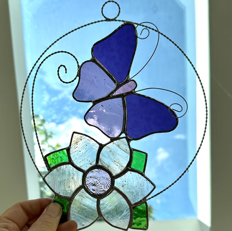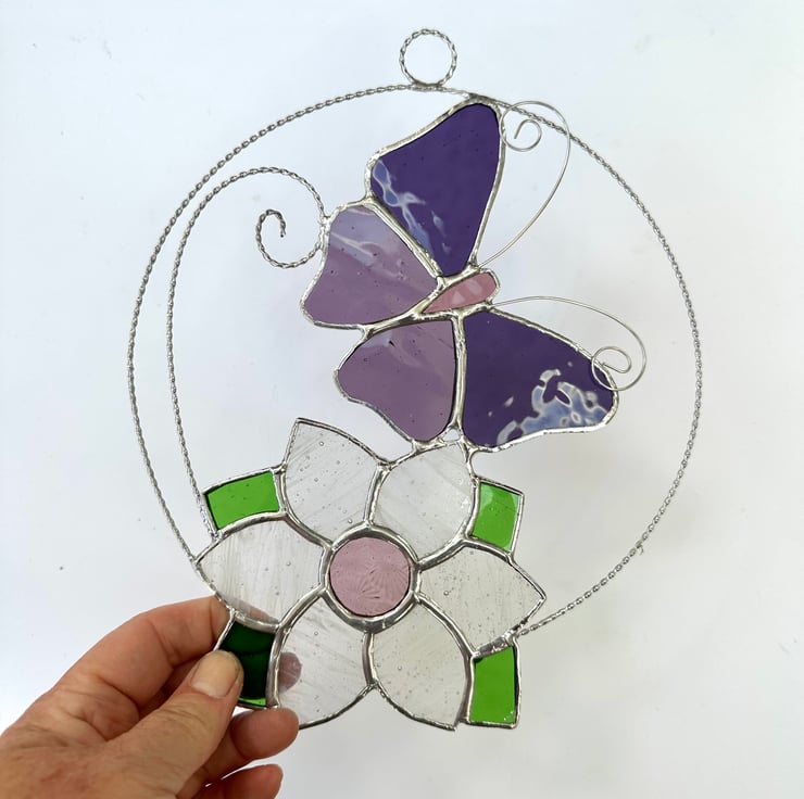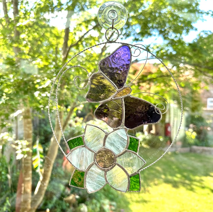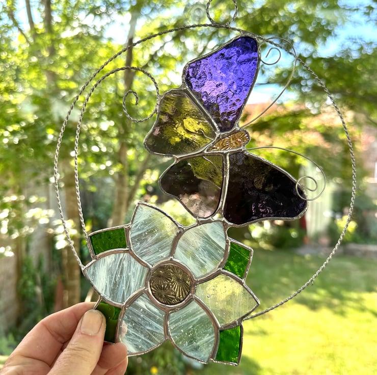 Butterfly and flower suncatcher made from stained glass by Carole’s Glass.