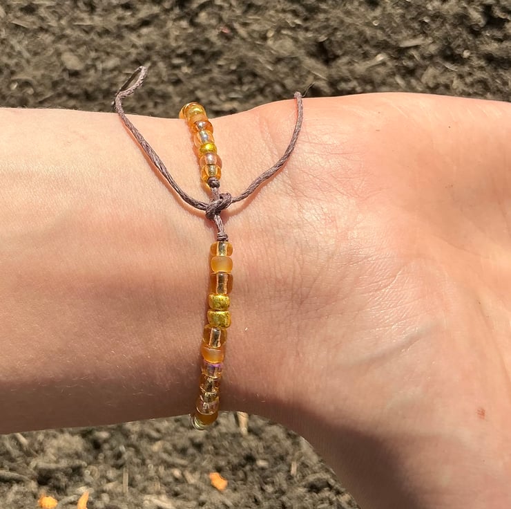 This bracelet has been made with glass seed beads (frosted, translucent and matt), that have been knotted onto some brown hemp cord and decorated with a pretty larger bead in the centre. Perfect for that boho, beach life style.