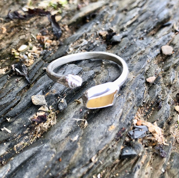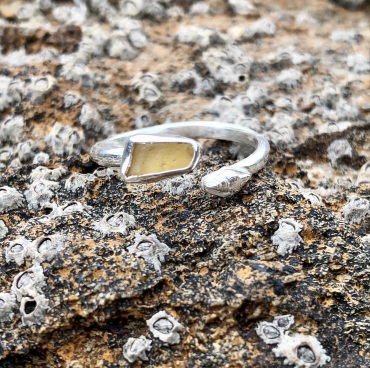 This beautiful piece of Yellow sea glass was found along the UK's South West coastline and has been set in a fine silver bezel (.999) with a recycled (ecosilver) sterling silver (.925) D wire to form a unique adjustable silver ring. A sterling silver shell detail has been added to this ring.