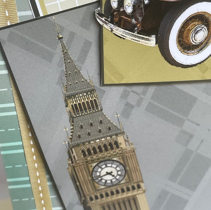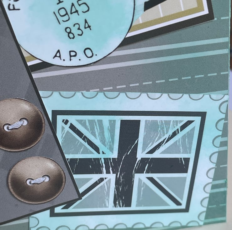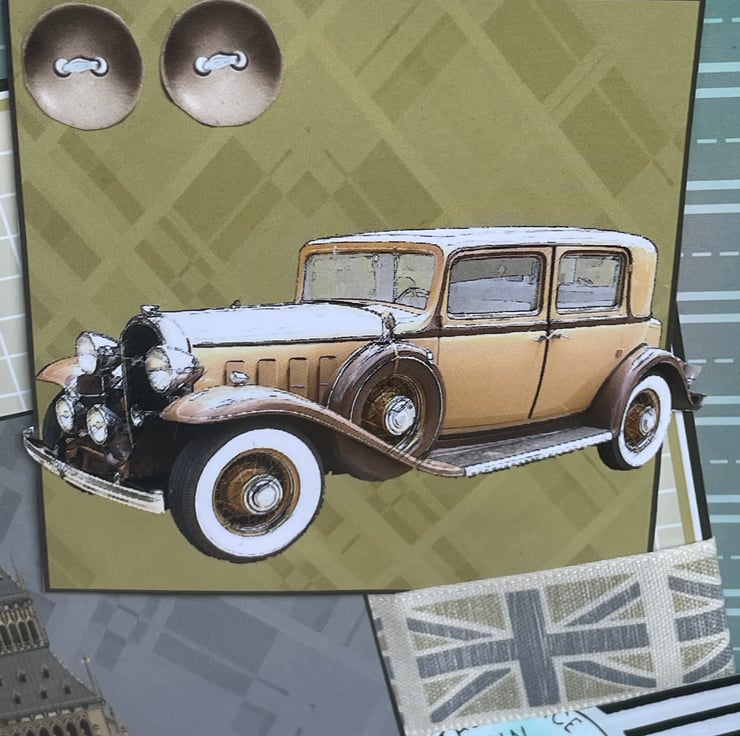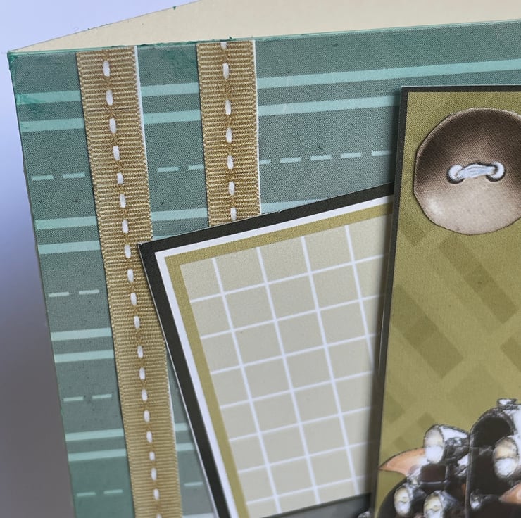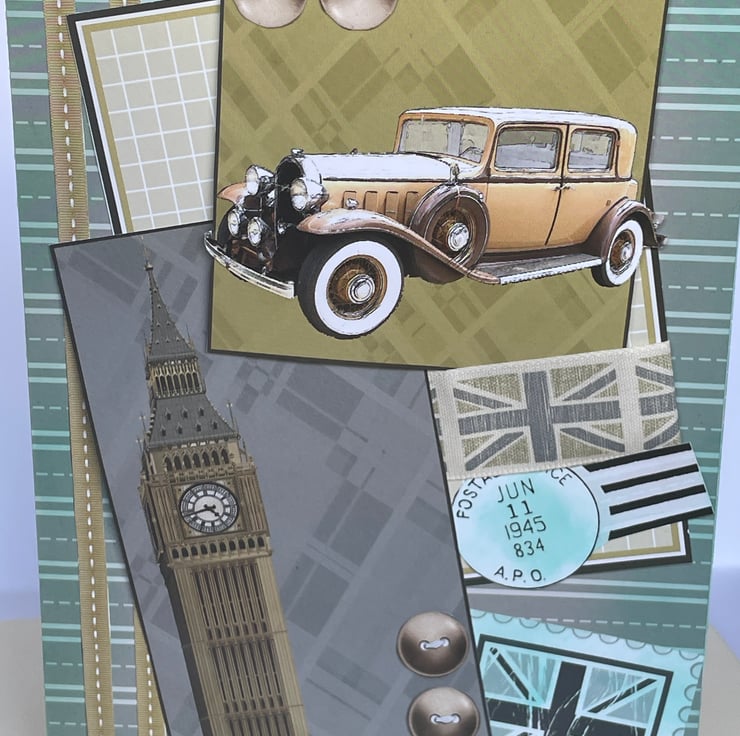 A thoroughly patriotic card to celebrate Father's day or a birthday. This A5 sized card has a grey green striped background. This is topped with several designs including a vintage car, an image of Big Ben, a union flag, a franking stamp and buttons. The design is finished with a union flag ribbon. There is no greeting on the outside or inside so the card can be used for Father's day, a birthday, or any other occasion.