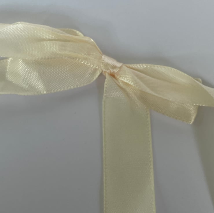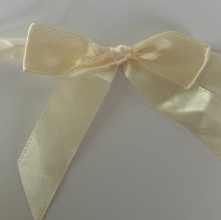 A set of cream ribbon bands with sticky pad to secure around a card or invitation. Each one had a pre-tied bow on it. The ribbon is satin and is 2cm wide. Each band is 33cm long, the sticky pad is on one end so the band is adjustable. There are 24 of them. Great for card making or invitations, they would be ideal for wedding invitations.