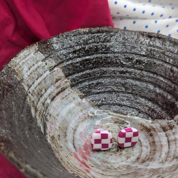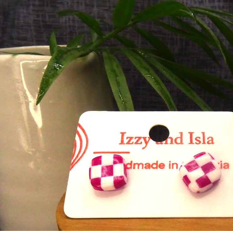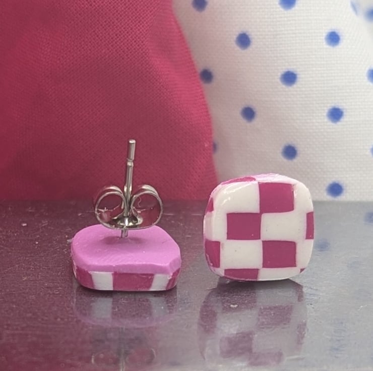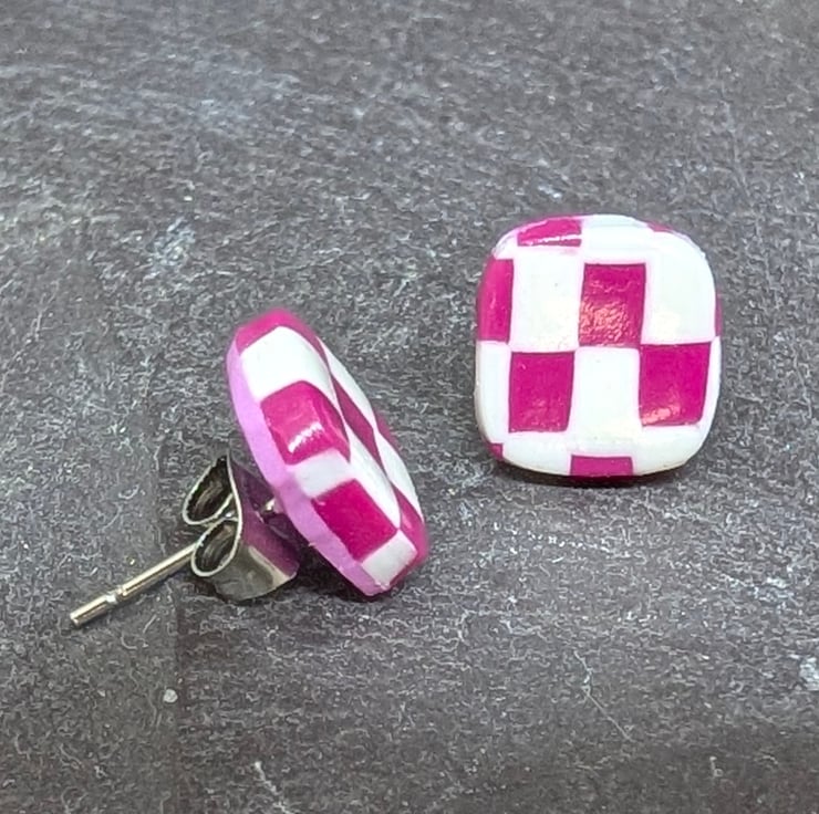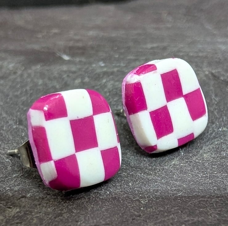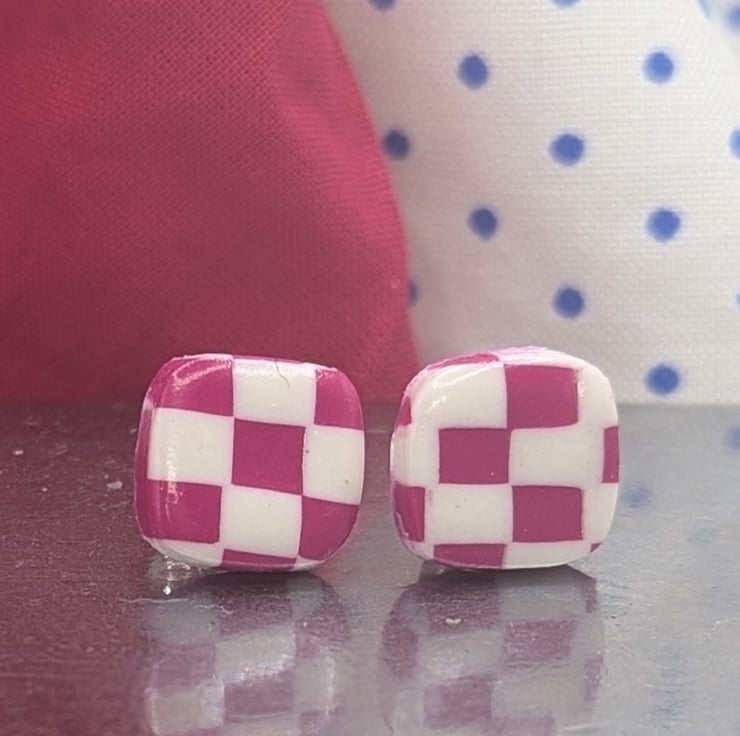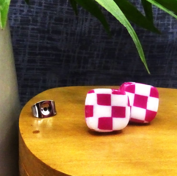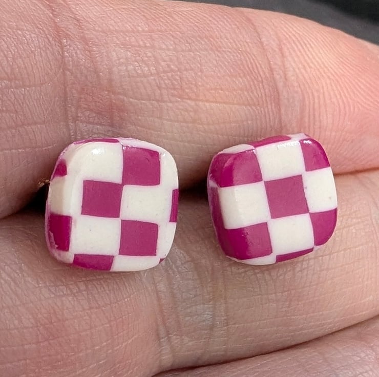Playful and bold, these handmade square studs feature a pink and white checkered design created from polymer clay. Each pair is individually crafted, so no two sets are quite the same. Sealed with a smooth varnish for a glossy finish, these earrings bring a fun pop of colour to any outfit.