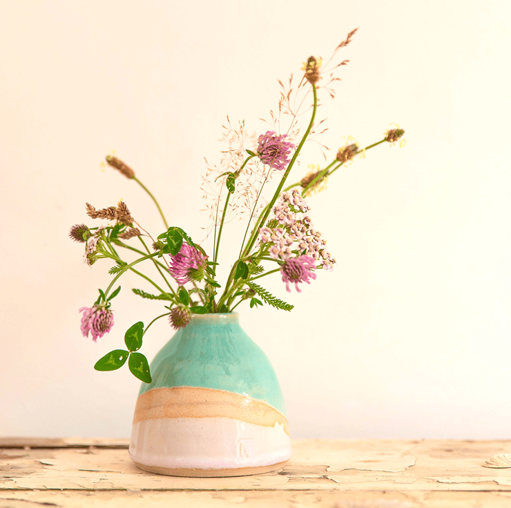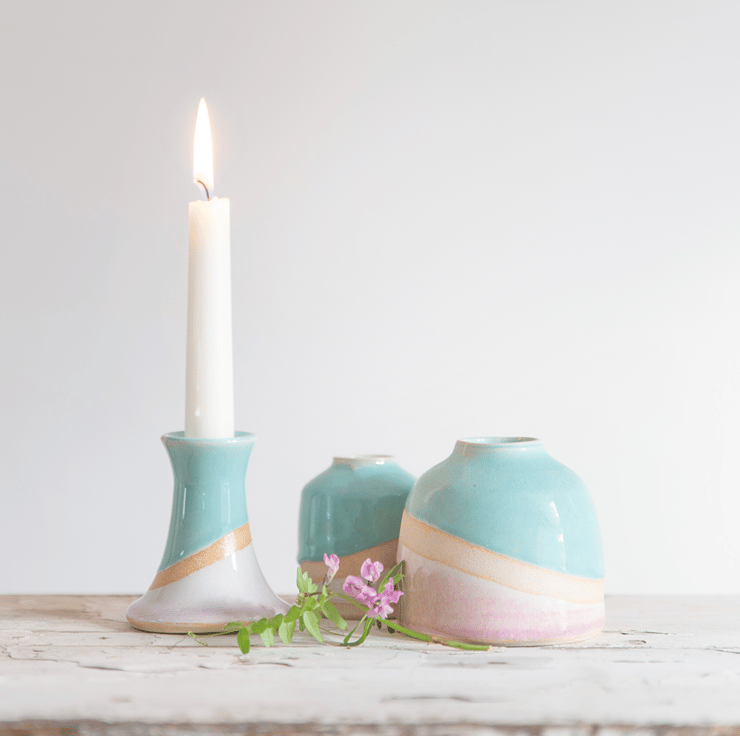 The turquoise resembles the colour of the sea on a summer's day, and the pink is especially unique with its speckled gradient. The natural clay, visible between the two glazes, bakes to a warm, sandy colour. We can only think of those happy moments, feeling the sand beneath our feet and paddling along the lapping shore, when looking at these cheerful vases.