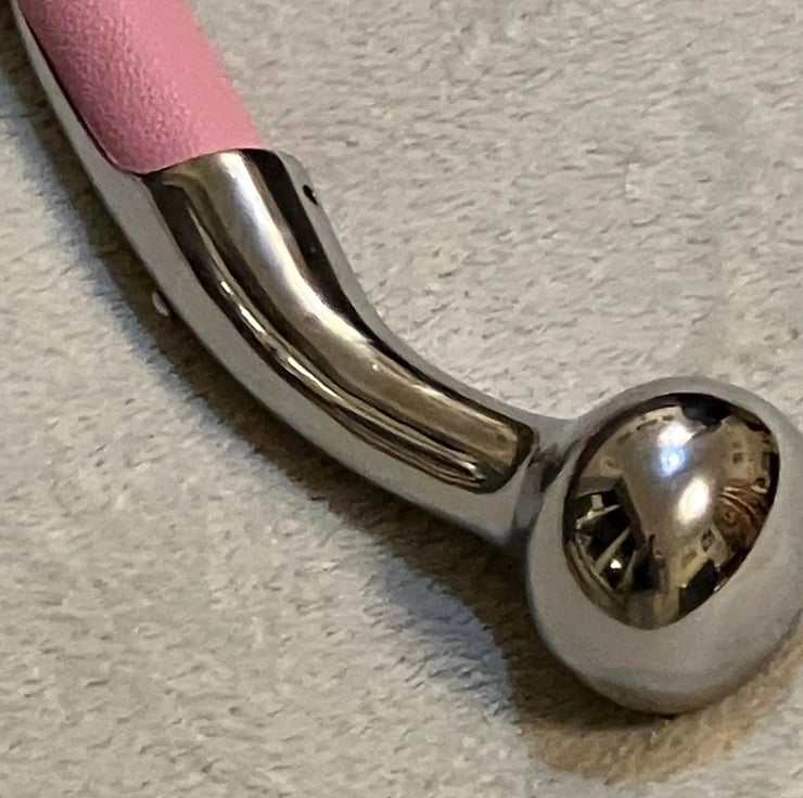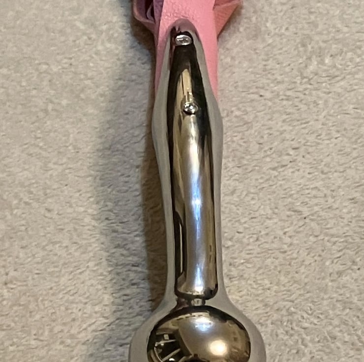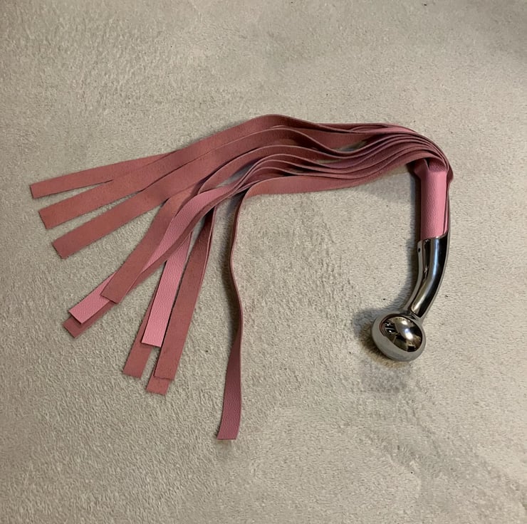 Medium Weight Bubblegum Cotton Candy Pink coloured leather flogger w/chrome handle (2-3 oz in weight).