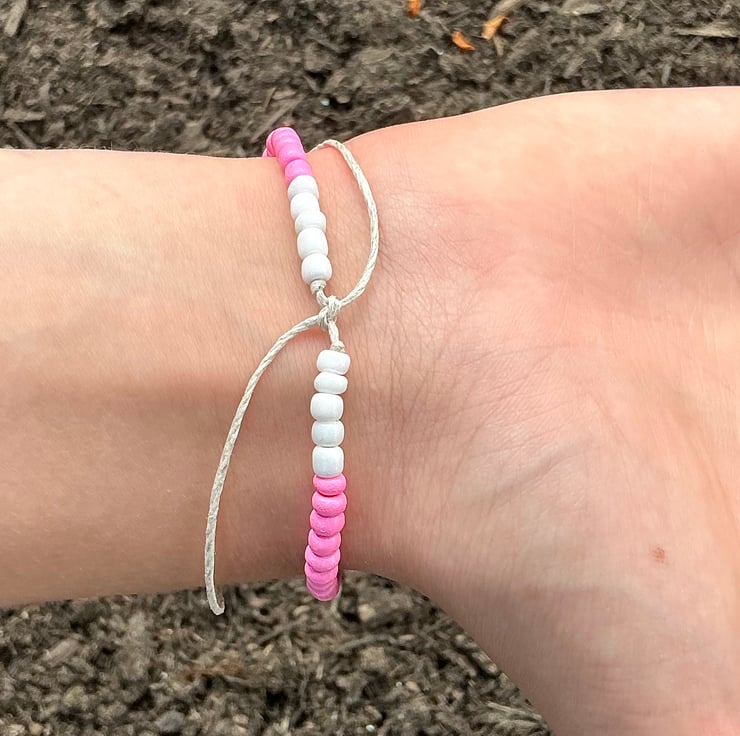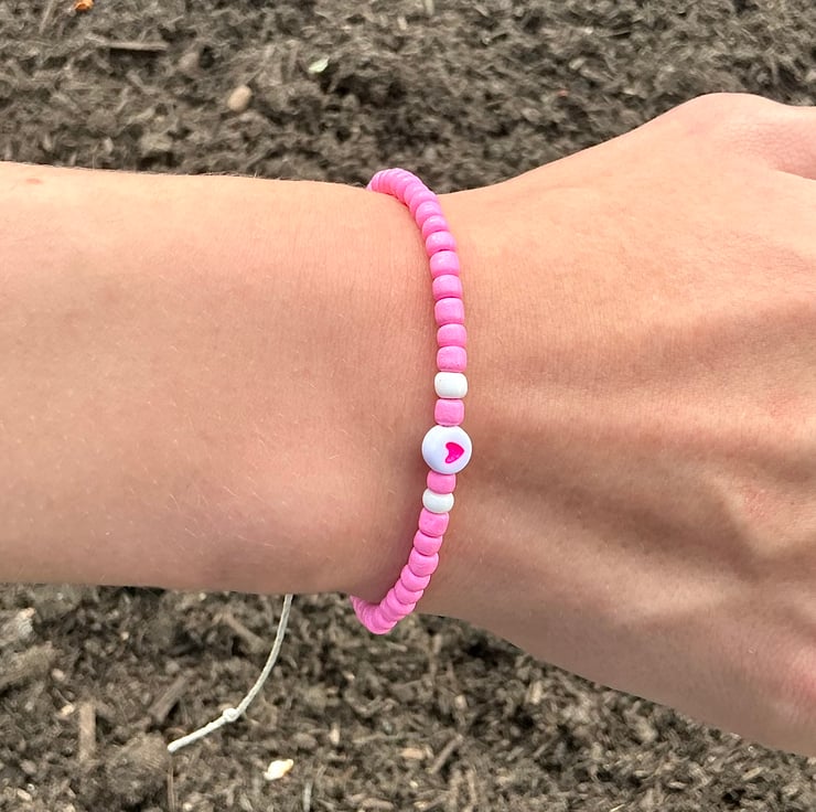 This pretty pink heart bracelet has been made with glass seed beads, that have been knotted onto some cream hemp cord. Perfect for that boho, beach life style.