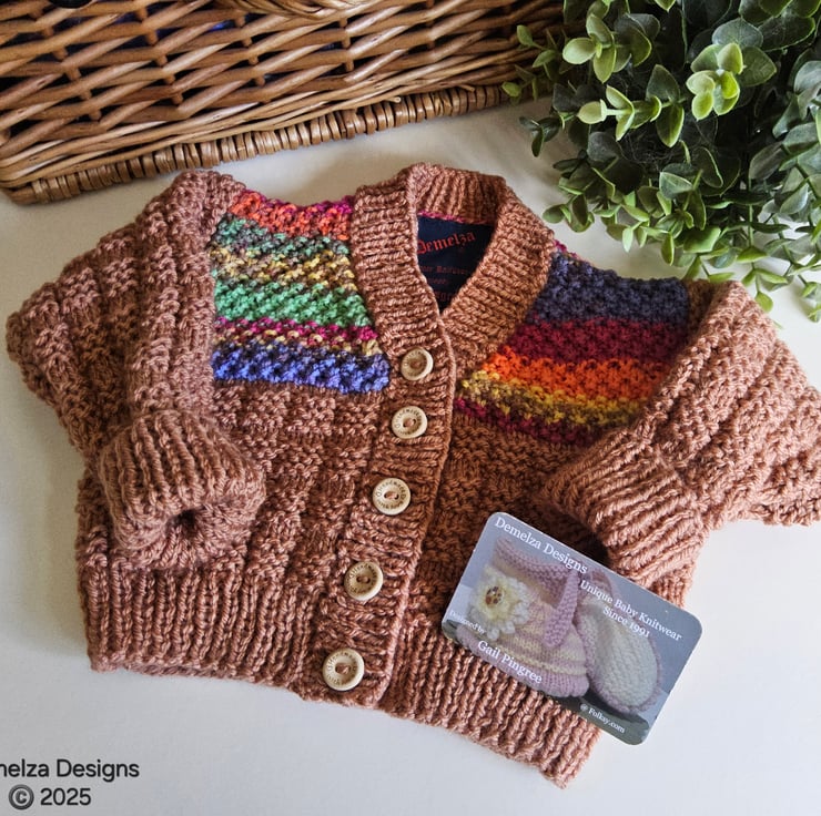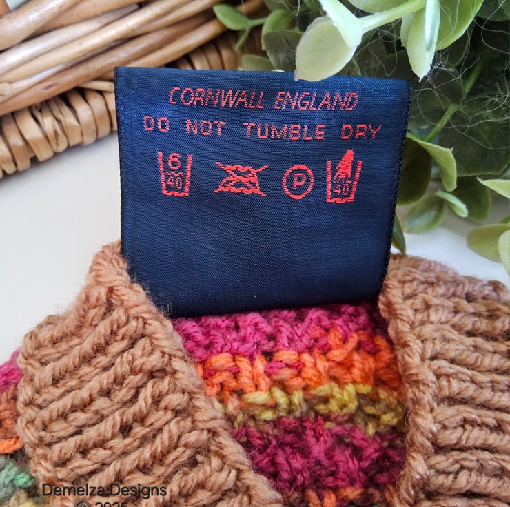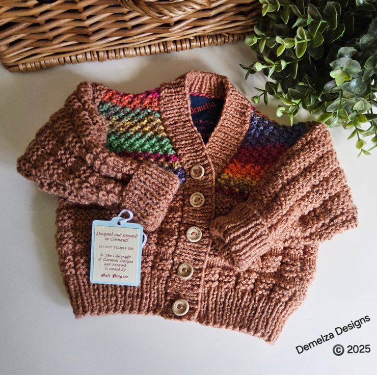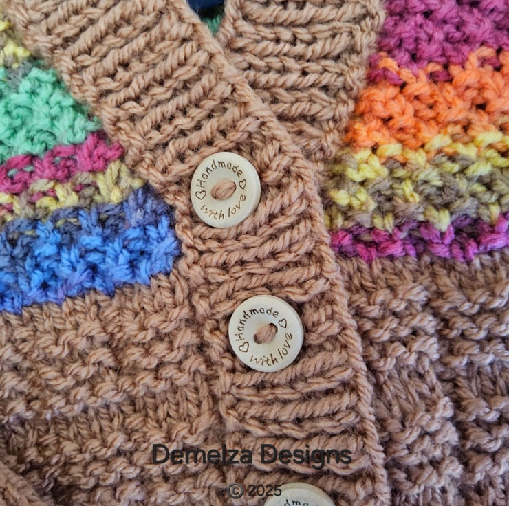This lovely cardigan has been designed and lovingly hand knitted in Cornwall using branded quality machine washable premium acrylic yarns. The Demelza Designs garment label is attached to the back neck edge with the care instructions woven within it on the reverse side for lasting reference. A Demelza garment swing tag will be attached to the cardigan front for a professional touch if gifting. The buttons are made from genuine wood with a sweet sentiment burnt etched on them.