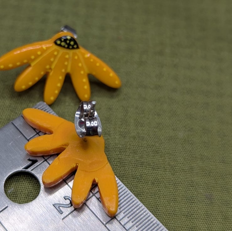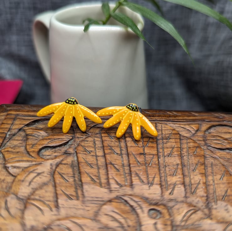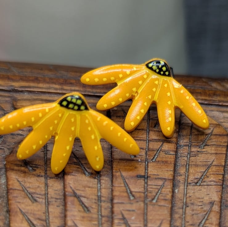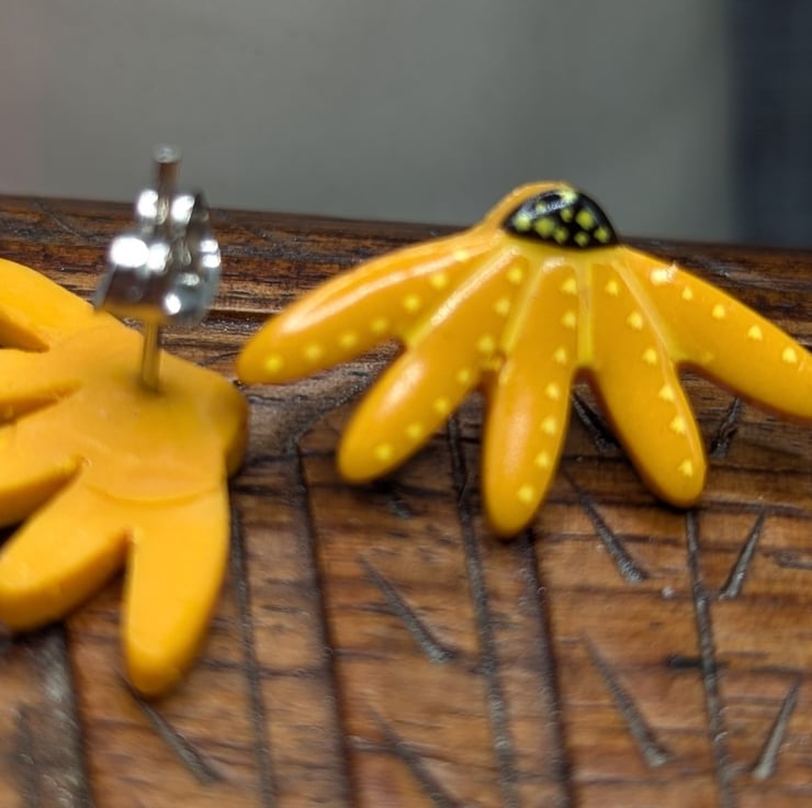 These handmade polymer clay stud earrings feature a charming flower design, crafted in vibrant yellow with delicate dotted detailing. Each petal is individually shaped and textured to resemble a blooming flower, while the black center and light yellow dots adds a playful, artistic touch.