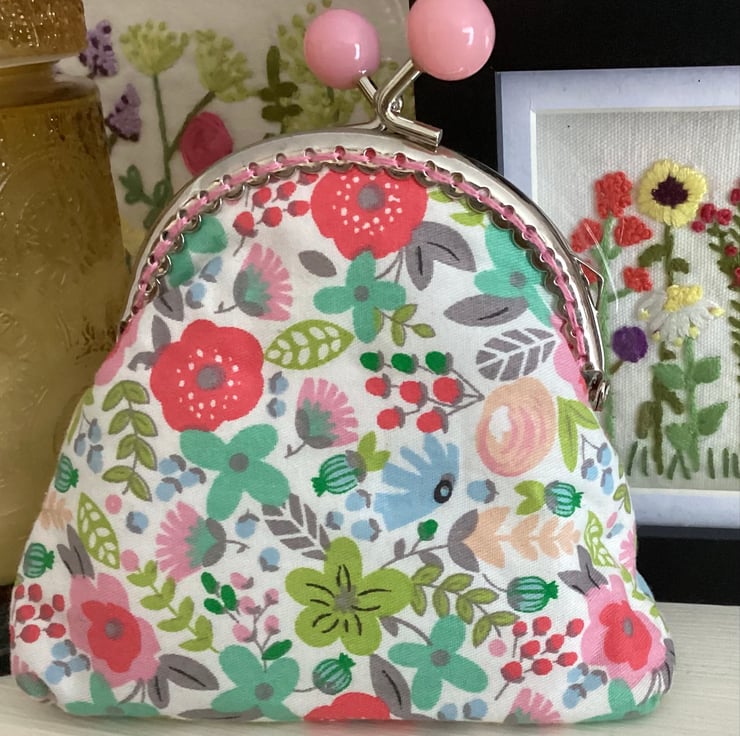 A lovely colourfull floral printed vintage look fabric made into a clasp coin purse. The clasp is sewn into this coin purse and is a pale pink ball, silver metal type. The background of this printed cotton fabric and the white shows off the flowers and leaves in greens blues pinks and peaches.The lining is the same fabric. The size is approx 14cm x 13cm so is perfect for a little coin purse gift .