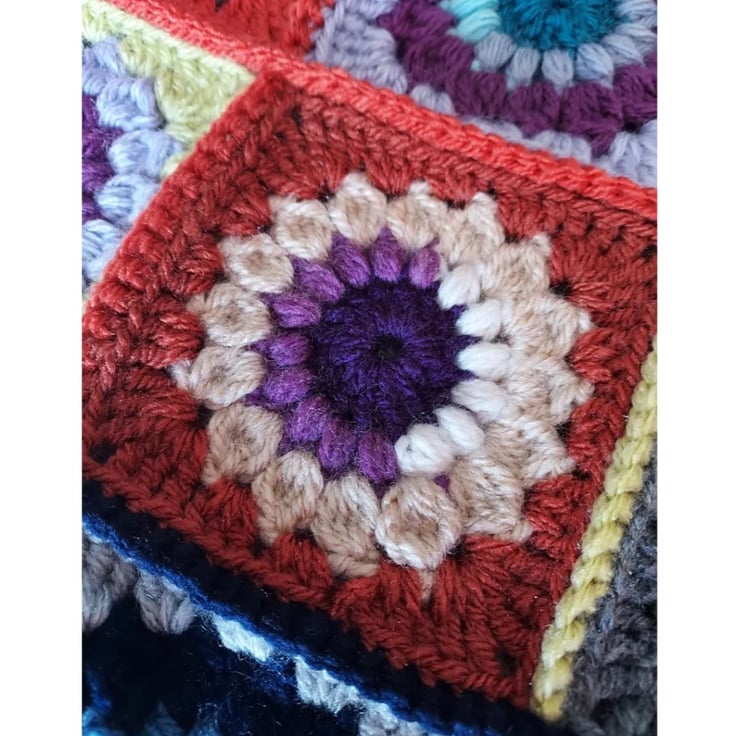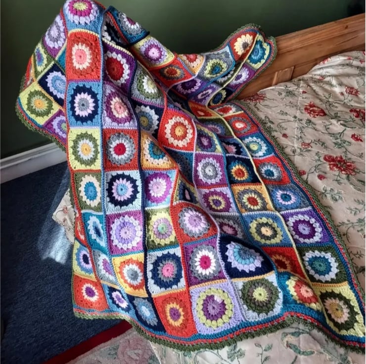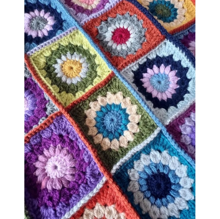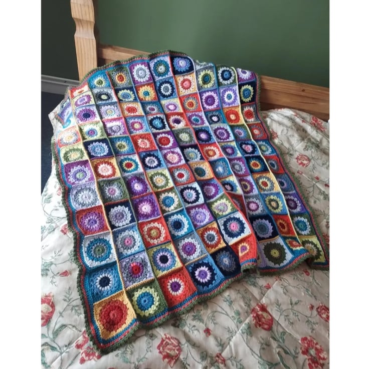 Hand crocheted throw of sun burst squares made from double knit acrylic yarn in vibrant colours including, denim, pale green, magenta, charcoal, silver, teal, gold, orange and lavender. This colourful throw measures approx 40 inches x 43 inches (102 cm x 109 cm), is machine washable at 30° and tumble dried on cool and would make a lovely cosy lap blanket or vibrant sofa throw. The colours may differ slightly to photos due to lighting. Delivery by Royal Mail 2nd class signed for. Thank you for looking.