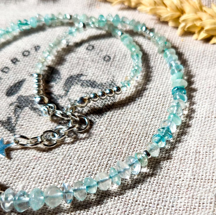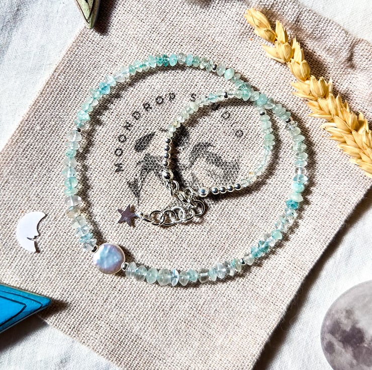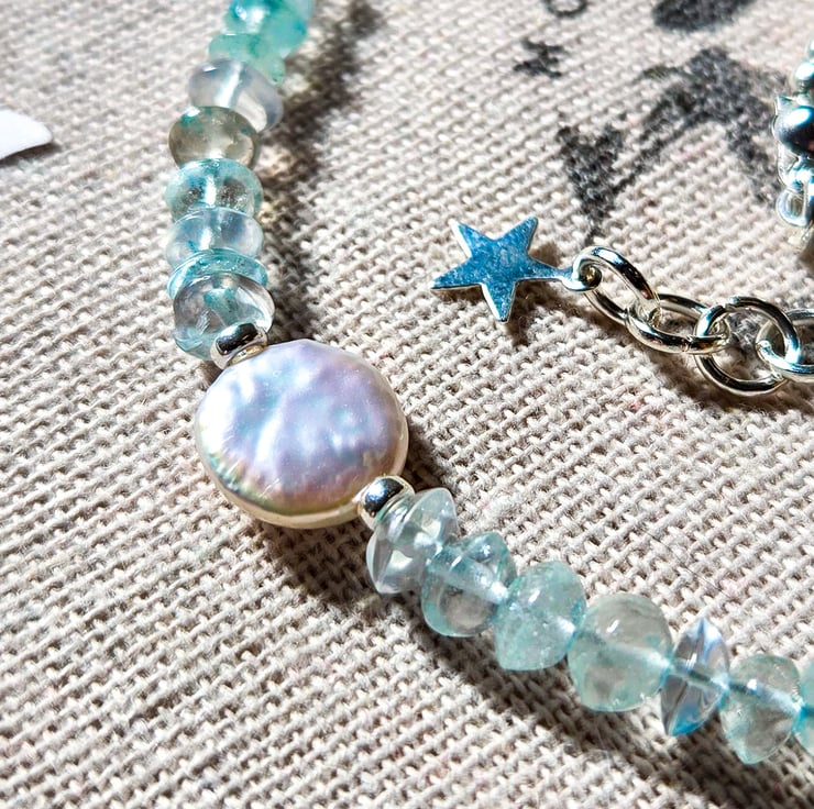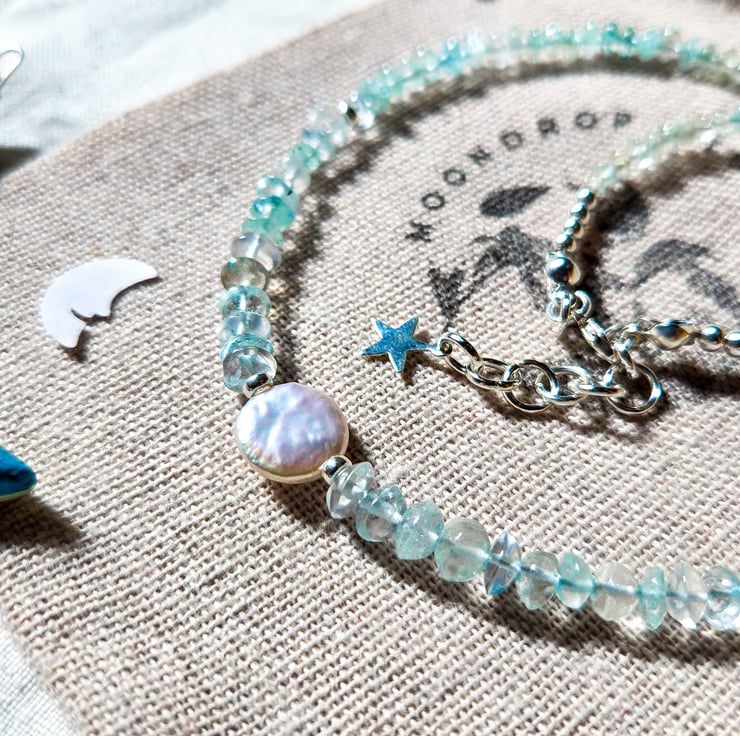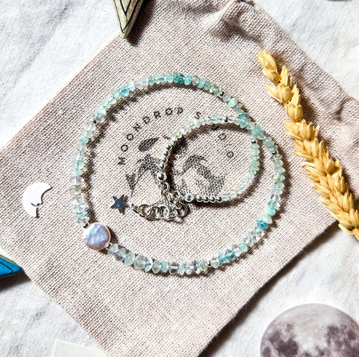 This calming little necklace features soft blue Aquamarine saucer-shaped gemstones, paired with a single, rainbow iridescent freshwater coin pearl in the centre that reminds me of a lovely Full Moon. It’s finished with a tiny sterling silver star charm on the extension chain for that extra little celestial touch.