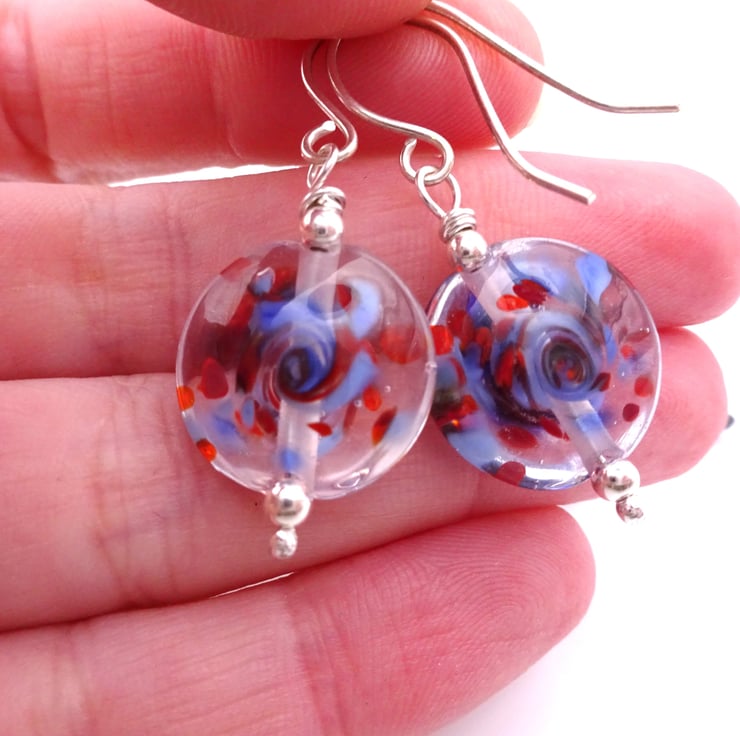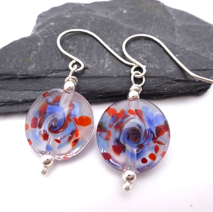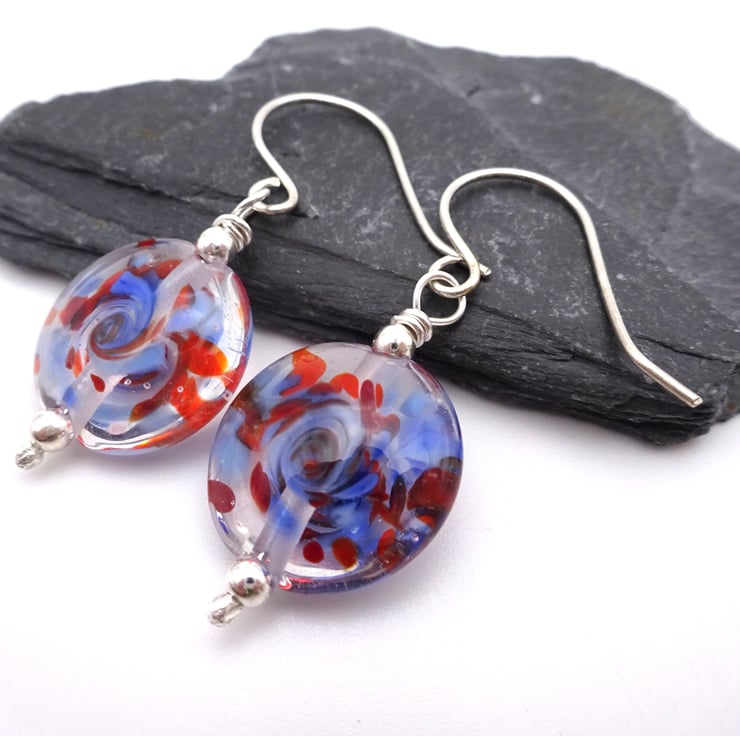 A pair of earrings made with handmade sterling silver ear wires and handmade lampwork glass beads.