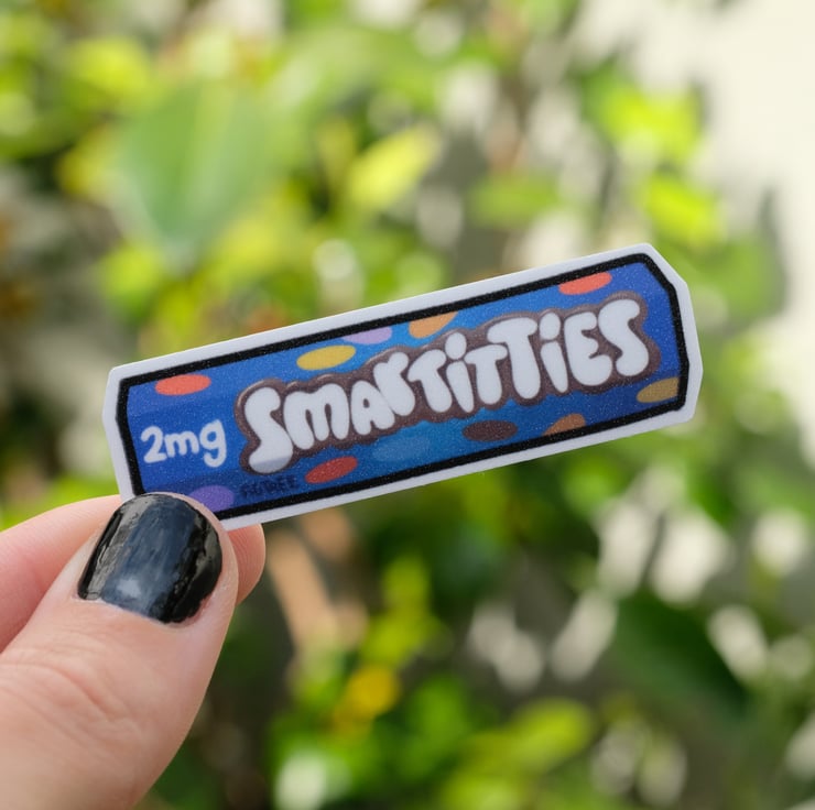 This 70mm sticker reimagines Smarties as Smart!tties — the brightly coloured brain-and-boob boosters of the transfemme world. Packed with oestradiol, serotonin, and a suspiciously powerful urge to start a sapphic book club.
