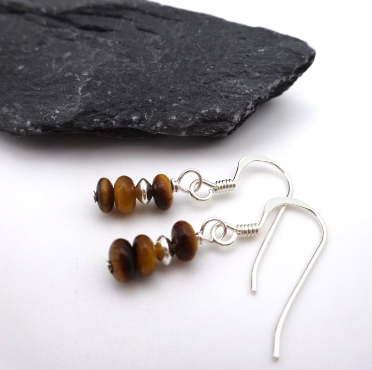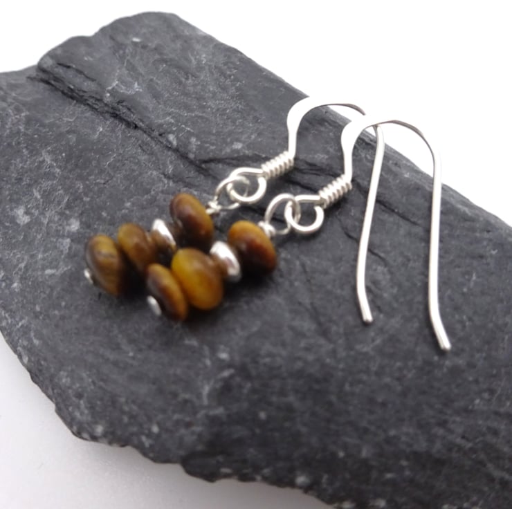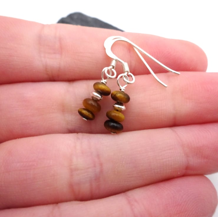 A pair of small sterling silver earrings which feature Tigers Eye gemstone beads and sterling silver beads.