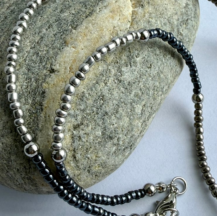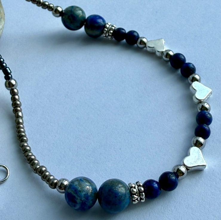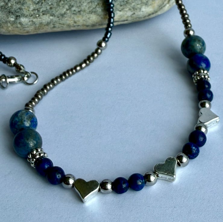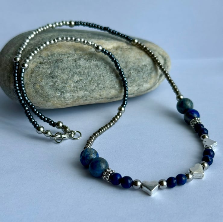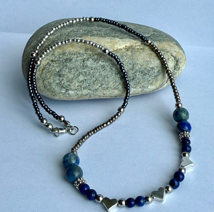 The second of my unique beaded chokers incorporating glass seed beads. For this one I have used 4mm and 8mm Lapis Luzuli gemstones. The larger of the Lapis has beautiful specks of gold pyrite inclusions running through it. Seed beads in varying colours, accents in stainless steel and silver plated hearts finish off this necklace beautifully. This would make a lovely piece to add to your everyday jewellery collection.