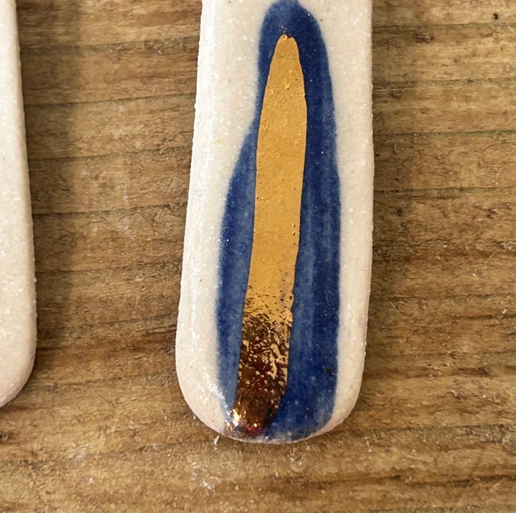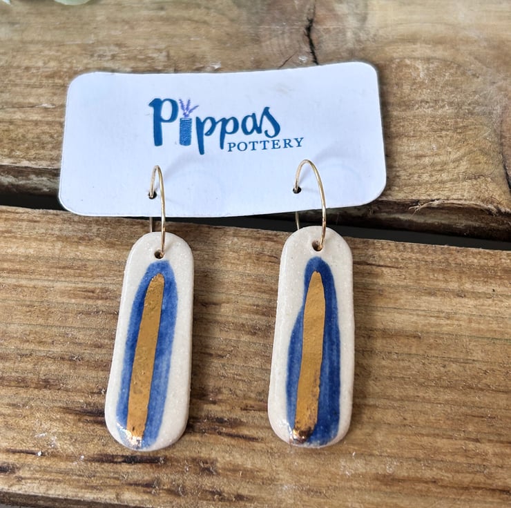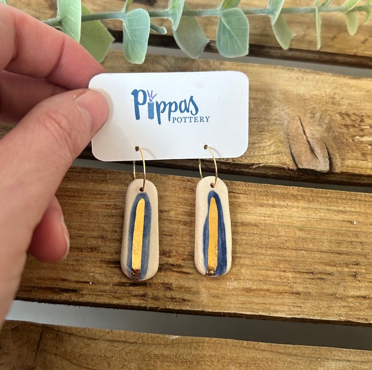 Blue and gold earrings hanging on 15mm 24kt gold plated hoops.