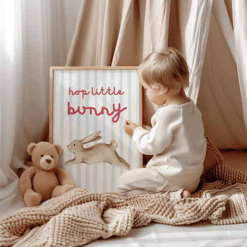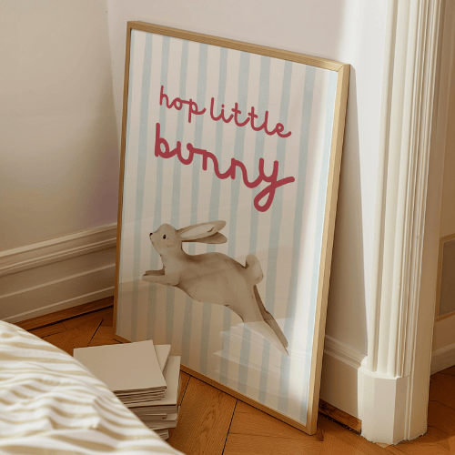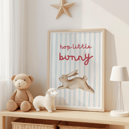 Transform your nursery or playroom with this charming 'Hop Little Bunny' wall art print. The delightful design features a watercolour-style leaping bunny set against a soft blue and white striped background, complemented by whimsical red lettering. This vintage-inspired piece brings a perfect blend of sweetness and sophistication to any child's space. Whether displayed above a cot, in a reading nook, or as part of a gallery wall, this print creates a cosy, inviting atmosphere. The gentle colour palette and classic design ensure it will grow with your child, making it a timeless addition to your nursery décor. The print works beautifully alongside other nursery essentials and can be coordinated with various decorating styles from traditional to contemporary boho. Create magical moments and spark imagination with this endearing piece that brings a touch of whimsy to your little one's special space.