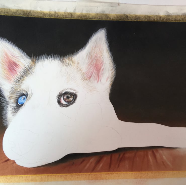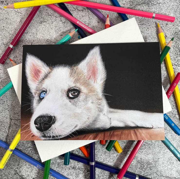 This artwork shows a very tired husky puppy, with the most beautiful eyes! Could also be framed as a small print.