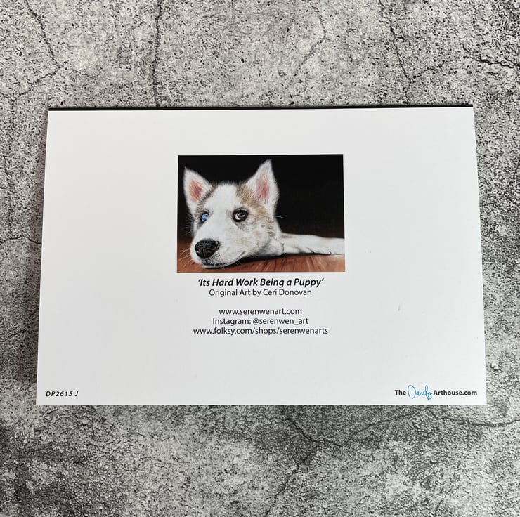 A blank card printed with my original coloured pencil drawing "It's Hard Work Being a Puppy"